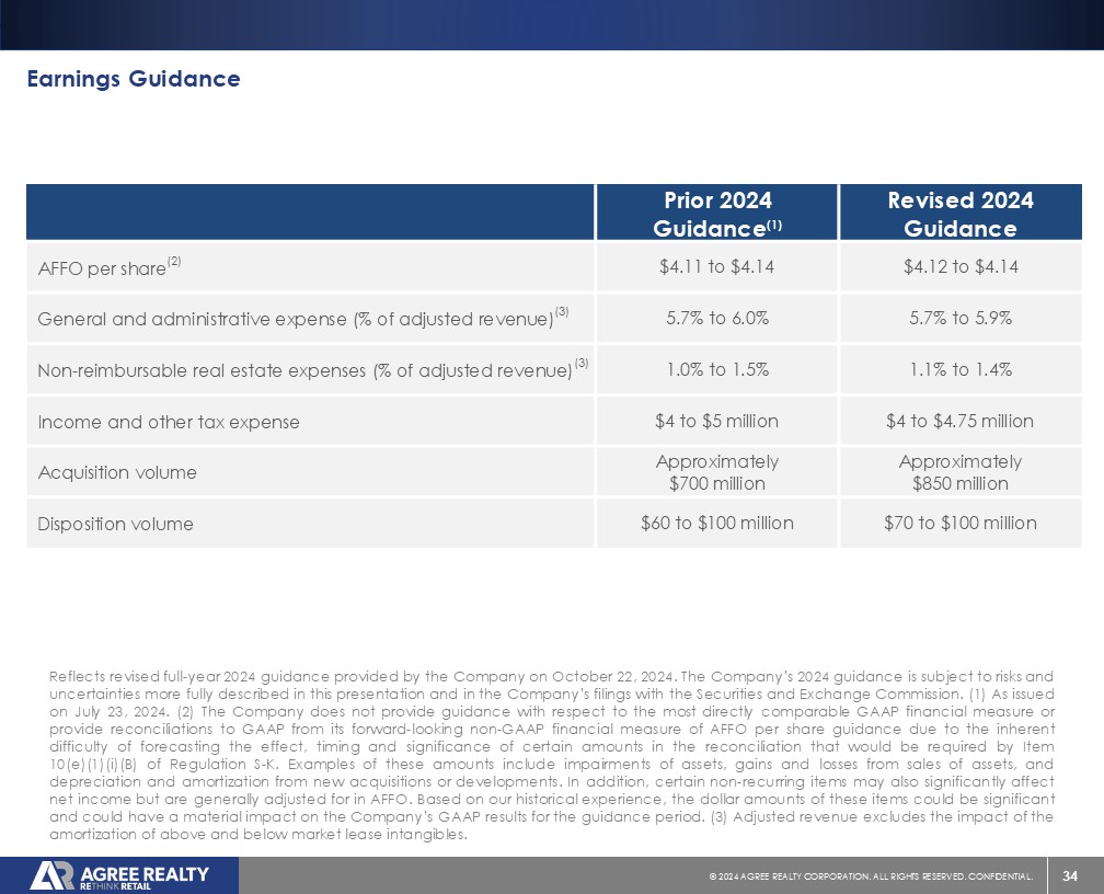 34 © 20 24 AGREE REALTY CORPORATION . ALL RIGHTS RESERVED. CONFIDENTIAL. Earnings Guidance Revised 2024 Guidance Prior 2024 Guidance (1) $4.12 to $4.14 $4.11 to $4.14 AFFO per share (2) 5.7% to 5.9% 5.7% to 6.0% General and administrative expense (% of adjusted revenue) (3) 1.0% to 1.4% 1.0% to 1.5% Non - reimbursable real estate expenses (% of adjusted revenue) (3) $4 to $4.75 million $4 to $5 million Income and other tax expense Approximately $850 million Approximately $700 million Acquisition volume $70 to $100 million $60 to $100 million Disposition volume Reflects revised full - year 2024 guidance provided by the Company on October 22 , 2024 . The Company’s 2024 guidance is subject to risks and uncertainties more fully described in this presentation and in the Company’s filings with the Securities and Exchange Commission . ( 1 ) As issued on July 23 , 2024 . ( 2 ) The Company does not provide guidance with respect to the most directly comparable GAAP financial measure or provide reconciliations to GAAP from its forward - looking non - GAAP financial measure of AFFO per share guidance due to the inherent difficulty of forecasting the effect, timing and significance of certain amounts in the reconciliation that would be required by Item 10 (e)( 1 )(i)(B) of Regulation S - K . Examples of these amounts include impairments of assets, gains and losses from sales of assets, and depreciation and amortization from new acquisitions or developments . In addition, certain non - recurring items may also significantly affect net income but are generally adjusted for in AFFO . Based on our historical experience, the dollar amounts of these items could be significant and could have a material impact on the Company’s GAAP results for the guidance period . ( 3 ) Adjusted revenue excludes the impact of the amortization of above and below market lease intangibles .