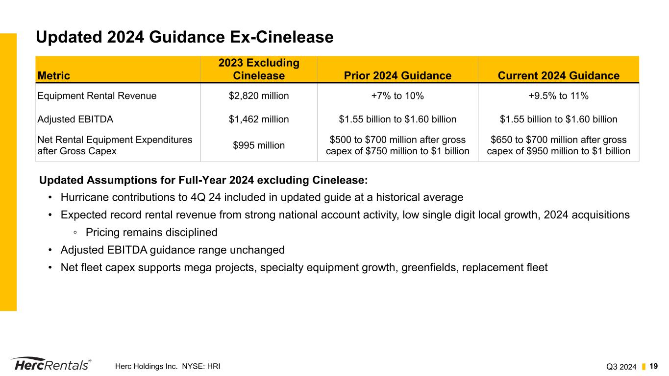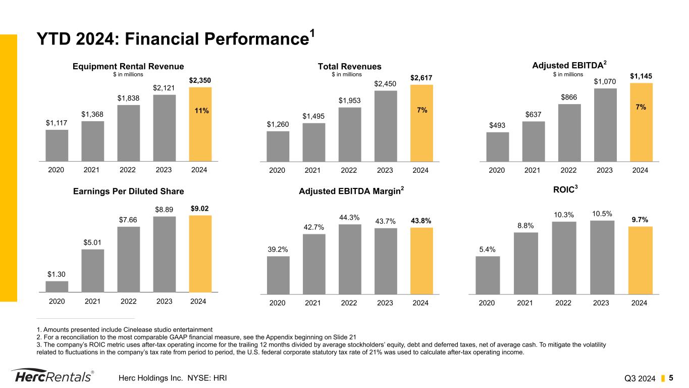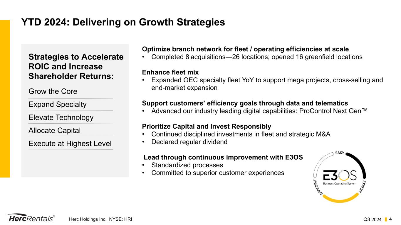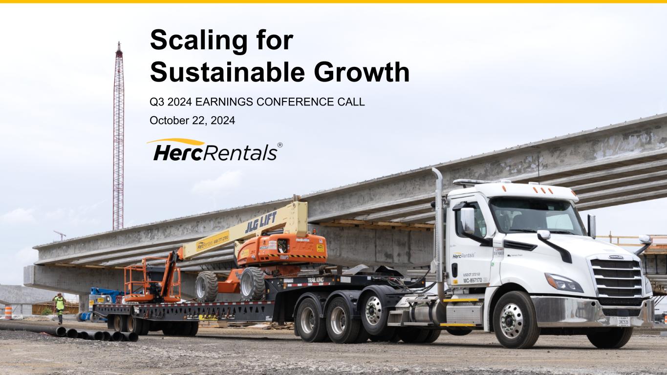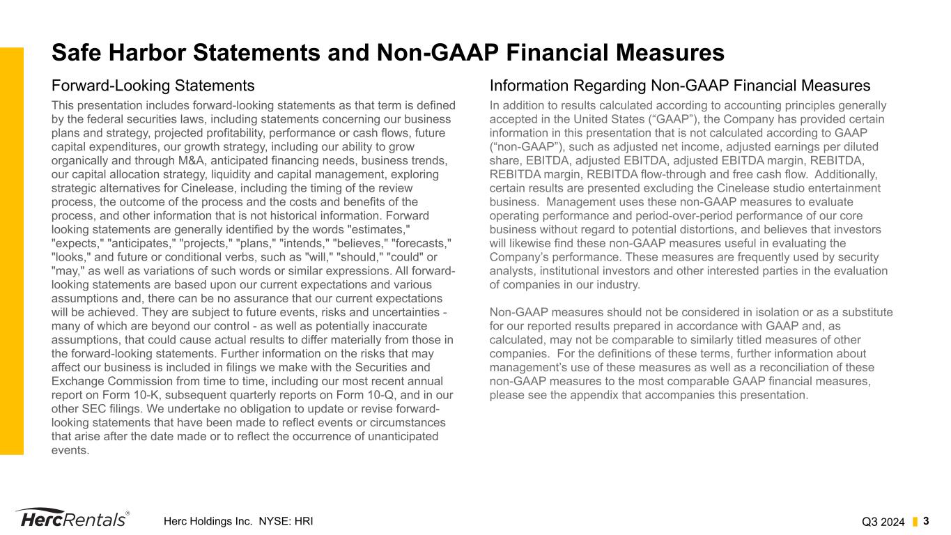 Q3 2024Herc Holdings Inc. NYSE: HRI 3 Safe Harbor Statements and Non-GAAP Financial Measures Forward-Looking Statements This presentation includes forward-looking statements as that term is defined by the federal securities laws, including statements concerning our business plans and strategy, projected profitability, performance or cash flows, future capital expenditures, our growth strategy, including our ability to grow organically and through M&A, anticipated financing needs, business trends, our capital allocation strategy, liquidity and capital management, exploring strategic alternatives for Cinelease, including the timing of the review process, the outcome of the process and the costs and benefits of the process, and other information that is not historical information. Forward looking statements are generally identified by the words "estimates," "expects," "anticipates," "projects," "plans," "intends," "believes," "forecasts," "looks," and future or conditional verbs, such as "will," "should," "could" or "may," as well as variations of such words or similar expressions. All forward- looking statements are based upon our current expectations and various assumptions and, there can be no assurance that our current expectations will be achieved. They are subject to future events, risks and uncertainties - many of which are beyond our control - as well as potentially inaccurate assumptions, that could cause actual results to differ materially from those in the forward-looking statements. Further information on the risks that may affect our business is included in filings we make with the Securities and Exchange Commission from time to time, including our most recent annual report on Form 10-K, subsequent quarterly reports on Form 10-Q, and in our other SEC filings. We undertake no obligation to update or revise forward- looking statements that have been made to reflect events or circumstances that arise after the date made or to reflect the occurrence of unanticipated events. Information Regarding Non-GAAP Financial Measures In addition to results calculated according to accounting principles generally accepted in the United States (“GAAP”), the Company has provided certain information in this presentation that is not calculated according to GAAP (“non-GAAP”), such as adjusted net income, adjusted earnings per diluted share, EBITDA, adjusted EBITDA, adjusted EBITDA margin, REBITDA, REBITDA margin, REBITDA flow-through and free cash flow. Additionally, certain results are presented excluding the Cinelease studio entertainment business. Management uses these non-GAAP measures to evaluate operating performance and period-over-period performance of our core business without regard to potential distortions, and believes that investors will likewise find these non-GAAP measures useful in evaluating the Company’s performance. These measures are frequently used by security analysts, institutional investors and other interested parties in the evaluation of companies in our industry. Non-GAAP measures should not be considered in isolation or as a substitute for our reported results prepared in accordance with GAAP and, as calculated, may not be comparable to similarly titled measures of other companies. For the definitions of these terms, further information about management’s use of these measures as well as a reconciliation of these non-GAAP measures to the most comparable GAAP financial measures, please see the appendix that accompanies this presentation.