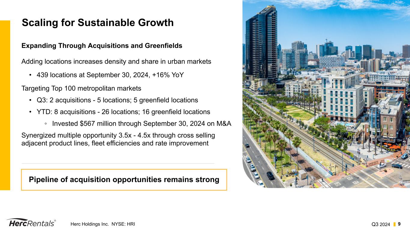 Q3 2024Herc Holdings Inc. NYSE: HRI 9 Scaling for Sustainable Growth Expanding Through Acquisitions and Greenfields Adding locations increases density and share in urban markets • 439 locations at September 30, 2024, +16% YoY Targeting Top 100 metropolitan markets • Q3: 2 acquisitions - 5 locations; 5 greenfield locations • YTD: 8 acquisitions - 26 locations; 16 greenfield locations ◦ Invested $567 million through September 30, 2024 on M&A Synergized multiple opportunity 3.5x - 4.5x through cross selling adjacent product lines, fleet efficiencies and rate improvement Pipeline of acquisition opportunities remains strong