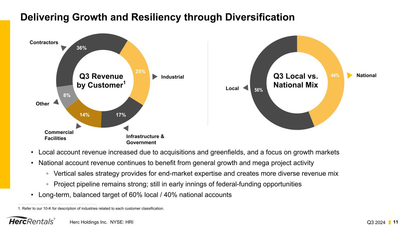 Q3 2024Herc Holdings Inc. NYSE: HRI 10 Optimizing Fleet Mix and Lifecycle Performance 1. Original equipment cost based on ARA guidelines. 2. End fleet as of September 30, 2024 $348 $400 $274 $196$167 $344 $366 2023 2024 Q1 Q2 Q3 Q4 Fleet Expenditures at OEC1 $ in millions $144 $186 $309 $174$150 $139 $199 2023 2024 Q1 Q2 Q3 Q4 Fleet Disposals at OEC1 $ in millions 23% 25% 11% 19% 22% • Q3 24 net fleet investment higher YoY ◦ 34% higher expenditures for mega projects, specialty, greenfields, replacement fleet ◦ 36% fewer dispositions at OEC reflect return to normal seasonality • Q3 24 disposals generated proceeds of ~42% of OEC • Average fleet age of 46 months at September 30, 2024 $7.1 billion at OEC1,2 Fleet Composition Specialty Aerial Earthmoving Material Handling Other