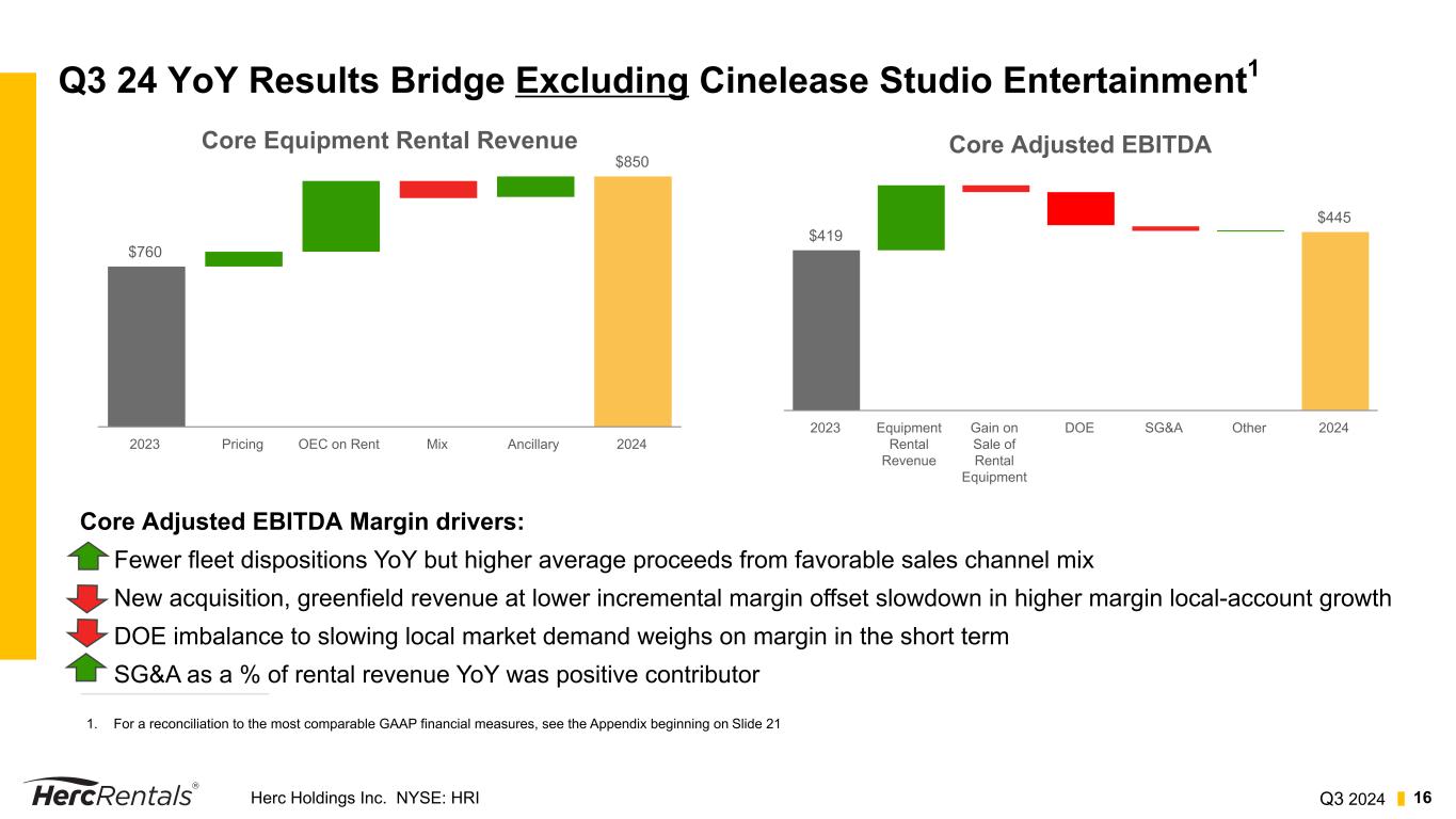 Q3 2024Herc Holdings Inc. NYSE: HRI 15 Q3 2024 Financial Results Excluding Cinelease Studio Entertainment1 NM - Not Meaningful 1. Results excluding the Cinelease studio entertainment business is referred to as "core" business. For a reconciliation to the most comparable GAAP financial measures, see the Appendix beginning on Slide 21 2. REBITDA measures contribution from our core rental business without impact of sales of equipment, parts and supplies 3. Based on ARA guidelines Three Months Ended September 30, Nine Months Ended September 30, $ in millions 2024 2023 2024 vs 2023 % Change 2024 2023 2024 vs 2023 % Change Core Equipment Rental Revenue $850 $760 11.8% $2,279 $2,081 9.5% Core Total Revenues $947 $901 5.1% $2,540 $2,405 5.6% Core Net Income $122 $128 (4.7)% $243 $284 (14.4)% Core Adjusted EBITDA $445 $419 6.2% $1,126 $1,077 4.5% Core Adjusted EBITDA Margin 47.0% 46.5% 50 bps 44.3% 44.8% (50) bps Core REBITDA2 $427 $390 9.5% $1,060 $990 7.1% Core REBITDA Margin2 49.7% 50.9% (120) bps 46.0% 47.2% (120) bps Core REBITDA YoY Flow-Through2 39.8% 72.5% NM 34.3% 56.3% NM Core Average Fleet3 (YoY) 12.3% 19.9% 10.6% 24.7% Core Dollar Utilization3 43.4% 44.1% (70) bps 41.8% 42.3% (50) bps Core ROIC 10.0% 11.6% (160) bps