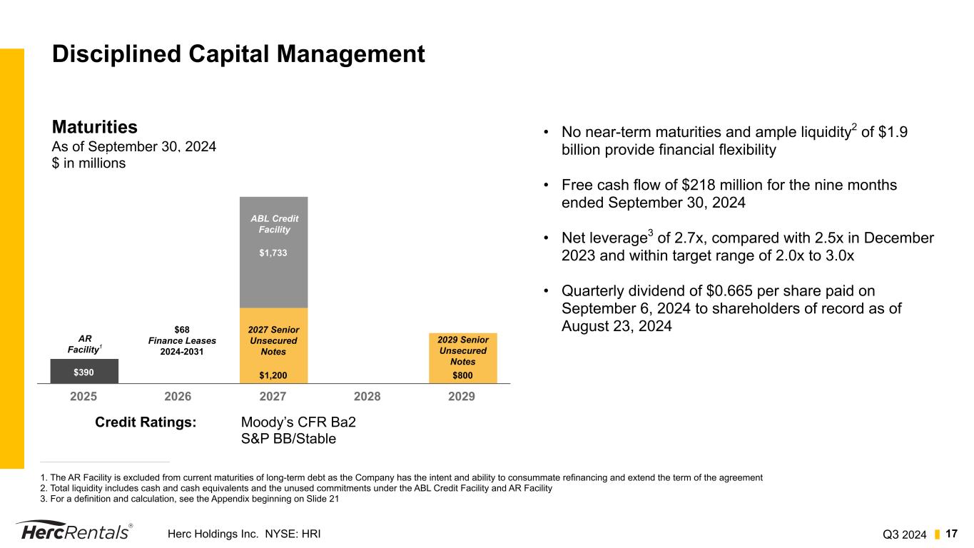 Q3 2024Herc Holdings Inc. NYSE: HRI 16 Q3 24 YoY Results Bridge Excluding Cinelease Studio Entertainment1 Core Equipment Rental Revenue $760 $850 2023 Pricing OEC on Rent Mix Ancillary 2024 Core Adjusted EBITDA $419 $445 2023 Equipment Rental Revenue Gain on Sale of Rental Equipment DOE SG&A Other 2024 Core Adjusted EBITDA Margin drivers: Fewer fleet dispositions YoY but higher average proceeds from favorable sales channel mix New acquisition, greenfield revenue at lower incremental margin offset slowdown in higher margin local-account growth DOE imbalance to slowing local market demand weighs on margin in the short term SG&A as a % of rental revenue YoY was positive contributor 1. For a reconciliation to the most comparable GAAP financial measures, see the Appendix beginning on Slide 21