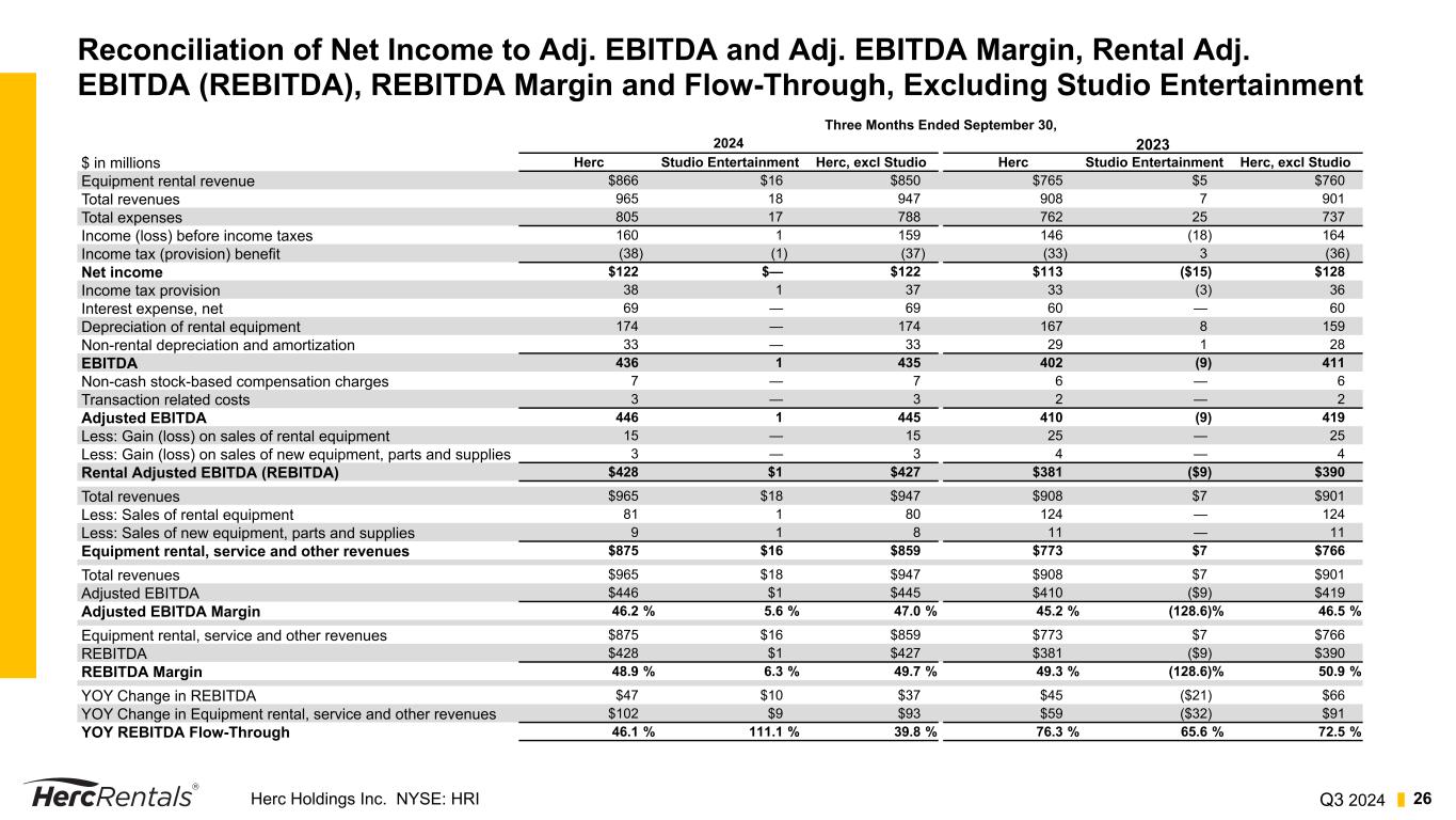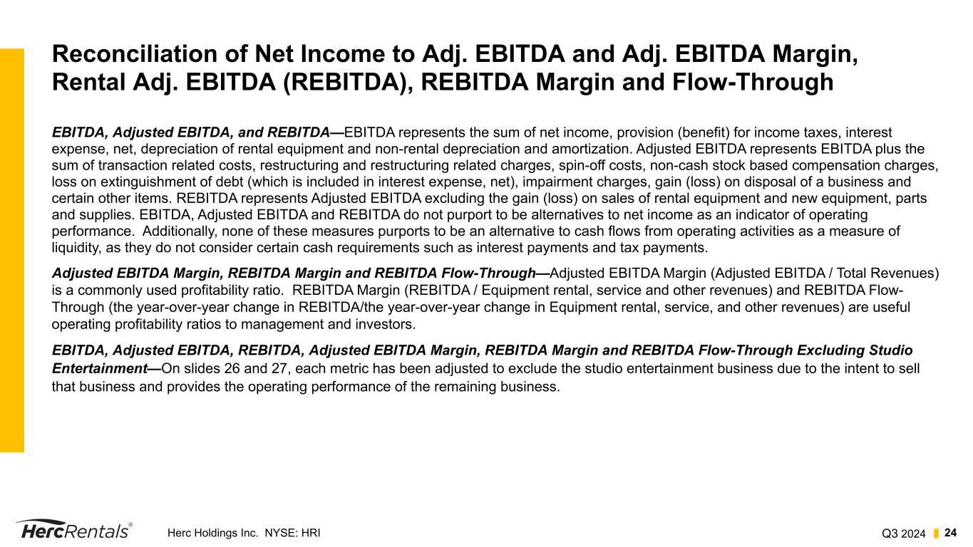 Q3 2024Herc Holdings Inc. NYSE: HRI 24 Reconciliation of Net Income to Adj. EBITDA and Adj. EBITDA Margin, Rental Adj. EBITDA (REBITDA), REBITDA Margin and Flow-Through EBITDA, Adjusted EBITDA, and REBITDA—EBITDA represents the sum of net income, provision (benefit) for income taxes, interest expense, net, depreciation of rental equipment and non-rental depreciation and amortization. Adjusted EBITDA represents EBITDA plus the sum of transaction related costs, restructuring and restructuring related charges, spin-off costs, non-cash stock based compensation charges, loss on extinguishment of debt (which is included in interest expense, net), impairment charges, gain (loss) on disposal of a business and certain other items. REBITDA represents Adjusted EBITDA excluding the gain (loss) on sales of rental equipment and new equipment, parts and supplies. EBITDA, Adjusted EBITDA and REBITDA do not purport to be alternatives to net income as an indicator of operating performance. Additionally, none of these measures purports to be an alternative to cash flows from operating activities as a measure of liquidity, as they do not consider certain cash requirements such as interest payments and tax payments. Adjusted EBITDA Margin, REBITDA Margin and REBITDA Flow-Through—Adjusted EBITDA Margin (Adjusted EBITDA / Total Revenues) is a commonly used profitability ratio. REBITDA Margin (REBITDA / Equipment rental, service and other revenues) and REBITDA Flow- Through (the year-over-year change in REBITDA/the year-over-year change in Equipment rental, service, and other revenues) are useful operating profitability ratios to management and investors. EBITDA, Adjusted EBITDA, REBITDA, Adjusted EBITDA Margin, REBITDA Margin and REBITDA Flow-Through Excluding Studio Entertainment—On slides 26 and 27, each metric has been adjusted to exclude the studio entertainment business due to the intent to sell that business and provides the operating performance of the remaining business.