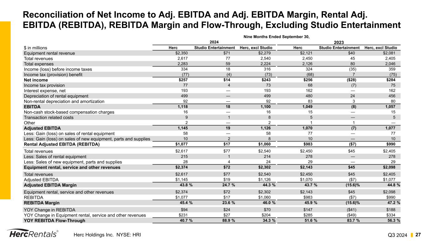 Q3 2024Herc Holdings Inc. NYSE: HRI 26 Reconciliation of Net Income to Adj. EBITDA and Adj. EBITDA Margin, Rental Adj. EBITDA (REBITDA), REBITDA Margin and Flow-Through, Excluding Studio Entertainment Three Months Ended September 30, 2024 2023 $ in millions Herc Studio Entertainment Herc, excl Studio Herc Studio Entertainment Herc, excl Studio Equipment rental revenue $866 $16 $850 $765 $5 $760 Total revenues 965 18 947 908 7 901 Total expenses 805 17 788 762 25 737 Income (loss) before income taxes 160 1 159 146 (18) 164 Income tax (provision) benefit (38) (1) (37) (33) 3 (36) Net income $122 $— $122 $113 ($15) $128 Income tax provision 38 1 37 33 (3) 36 Interest expense, net 69 — 69 60 — 60 Depreciation of rental equipment 174 — 174 167 8 159 Non-rental depreciation and amortization 33 — 33 29 1 28 EBITDA 436 1 435 402 (9) 411 Non-cash stock-based compensation charges 7 — 7 6 — 6 Transaction related costs 3 — 3 2 — 2 Adjusted EBITDA 446 1 445 410 (9) 419 Less: Gain (loss) on sales of rental equipment 15 — 15 25 — 25 Less: Gain (loss) on sales of new equipment, parts and supplies 3 — 3 4 — 4 Rental Adjusted EBITDA (REBITDA) $428 $1 $427 $381 ($9) $390 Total revenues $965 $18 $947 $908 $7 $901 Less: Sales of rental equipment 81 1 80 124 — 124 Less: Sales of new equipment, parts and supplies 9 1 8 11 — 11 Equipment rental, service and other revenues $875 $16 $859 $773 $7 $766 Total revenues $965 $18 $947 $908 $7 $901 Adjusted EBITDA $446 $1 $445 $410 ($9) $419 Adjusted EBITDA Margin 46.2 % 5.6 % 47.0 % 45.2 % (128.6) % 46.5 % Equipment rental, service and other revenues $875 $16 $859 $773 $7 $766 REBITDA $428 $1 $427 $381 ($9) $390 REBITDA Margin 48.9 % 6.3 % 49.7 % 49.3 % (128.6) % 50.9 % YOY Change in REBITDA $47 $10 $37 $45 ($21) $66 YOY Change in Equipment rental, service and other revenues $102 $9 $93 $59 ($32) $91 YOY REBITDA Flow-Through 46.1 % 111.1 % 39.8 % 76.3 % 65.6 % 72.5 %