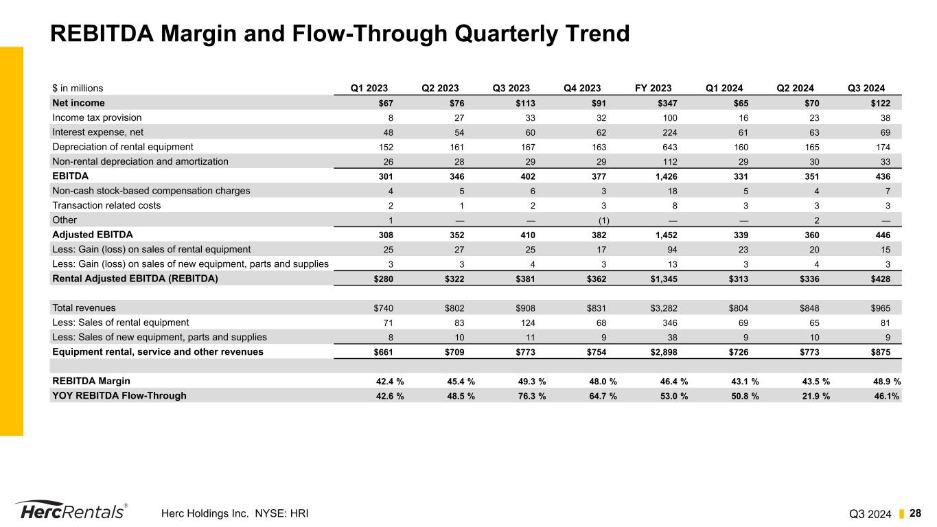 Q3 2024Herc Holdings Inc. NYSE: HRI 27 Reconciliation of Net Income to Adj. EBITDA and Adj. EBITDA Margin, Rental Adj. EBITDA (REBITDA), REBITDA Margin and Flow-Through, Excluding Studio Entertainment Nine Months Ended September 30, 2024 2023 $ in millions Herc Studio Entertainment Herc, excl Studio Herc Studio Entertainment Herc, excl Studio Equipment rental revenue $2,350 $71 $2,279 $2,121 $40 $2,081 Total revenues 2,617 77 2,540 2,450 45 2,405 Total expenses 2,283 59 2,224 2,126 80 2,046 Income (loss) before income taxes 334 18 316 324 (35) 359 Income tax (provision) benefit (77) (4) (73) (68) 7 (75) Net income $257 $14 $243 $256 ($28) $284 Income tax provision 77 4 73 68 (7) 75 Interest expense, net 193 — 193 162 — 162 Depreciation of rental equipment 499 — 499 480 24 456 Non-rental depreciation and amortization 92 — 92 83 3 80 EBITDA 1,118 18 1,100 1,049 (8) 1,057 Non-cash stock-based compensation charges 16 — 16 15 — 15 Transaction related costs 9 1 8 5 — 5 Other 2 — 2 1 1 — Adjusted EBITDA 1,145 19 1,126 1,070 (7) 1,077 Less: Gain (loss) on sales of rental equipment 58 — 58 77 — 77 Less: Gain (loss) on sales of new equipment, parts and supplies 10 2 8 10 — 10 Rental Adjusted EBITDA (REBITDA) $1,077 $17 $1,060 $983 ($7) $990 Total revenues $2,617 $77 $2,540 $2,450 $45 $2,405 Less: Sales of rental equipment 215 1 214 278 — 278 Less: Sales of new equipment, parts and supplies 28 4 24 29 — 29 Equipment rental, service and other revenues $2,374 $72 $2,302 $2,143 $45 $2,098 Total revenues $2,617 $77 $2,540 $2,450 $45 $2,405 Adjusted EBITDA $1,145 $19 $1,126 $1,070 ($7) $1,077 Adjusted EBITDA Margin 43.8 % 24.7 % 44.3 % 43.7 % (15.6) % 44.8 % Equipment rental, service and other revenues $2,374 $72 $2,302 $2,143 $45 $2,098 REBITDA $1,077 $17 $1,060 $983 ($7) $990 REBITDA Margin 45.4 % 23.6 % 46.0 % 45.9 % (15.6) % 47.2 % YOY Change in REBITDA $94 $24 $70 $147 ($41) $188 YOY Change in Equipment rental, service and other revenues $231 $27 $204 $285 ($49) $334 YOY REBITDA Flow-Through 40.7 % 88.9 % 34.3 % 51.6 % 83.7 % 56.3 %