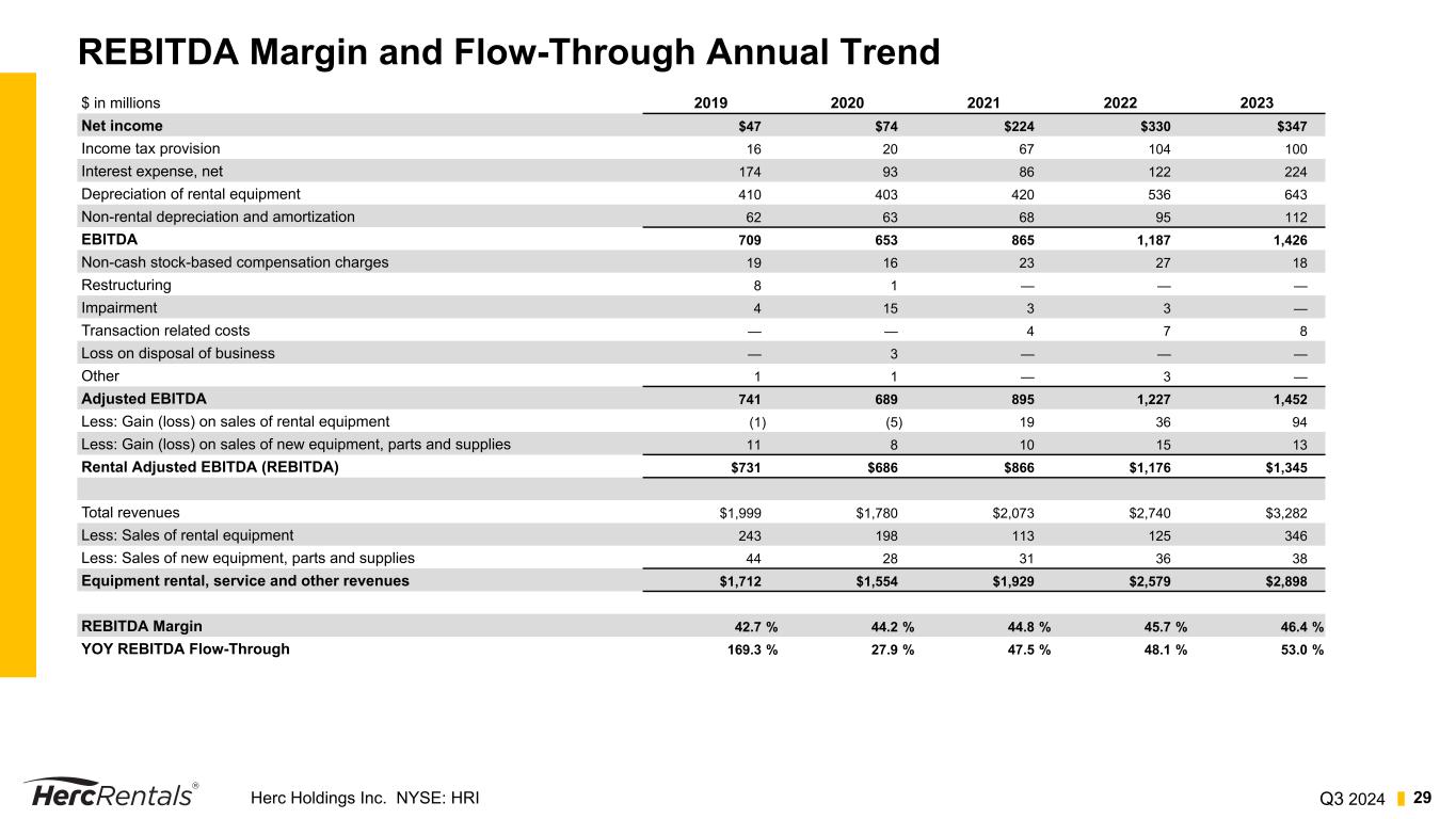 Q3 2024Herc Holdings Inc. NYSE: HRI 28 REBITDA Margin and Flow-Through Quarterly Trend $ in millions Q1 2023 Q2 2023 Q3 2023 Q4 2023 FY 2023 Q1 2024 Q2 2024 Q3 2024 Net income $67 $76 $113 $91 $347 $65 $70 $122 Income tax provision 8 27 33 32 100 16 23 38 Interest expense, net 48 54 60 62 224 61 63 69 Depreciation of rental equipment 152 161 167 163 643 160 165 174 Non-rental depreciation and amortization 26 28 29 29 112 29 30 33 EBITDA 301 346 402 377 1,426 331 351 436 Non-cash stock-based compensation charges 4 5 6 3 18 5 4 7 Transaction related costs 2 1 2 3 8 3 3 3 Other 1 — — (1) — — 2 — Adjusted EBITDA 308 352 410 382 1,452 339 360 446 Less: Gain (loss) on sales of rental equipment 25 27 25 17 94 23 20 15 Less: Gain (loss) on sales of new equipment, parts and supplies 3 3 4 3 13 3 4 3 Rental Adjusted EBITDA (REBITDA) $280 $322 $381 $362 $1,345 $313 $336 $428 Total revenues $740 $802 $908 $831 $3,282 $804 $848 $965 Less: Sales of rental equipment 71 83 124 68 346 69 65 81 Less: Sales of new equipment, parts and supplies 8 10 11 9 38 9 10 9 Equipment rental, service and other revenues $661 $709 $773 $754 $2,898 $726 $773 $875 REBITDA Margin 42.4 % 45.4 % 49.3 % 48.0 % 46.4 % 43.1 % 43.5 % 48.9 % YOY REBITDA Flow-Through 42.6 % 48.5 % 76.3 % 64.7 % 53.0 % 50.8 % 21.9 % 46.1%