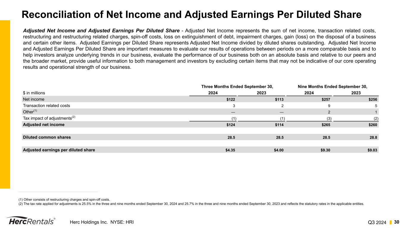 Q3 2024Herc Holdings Inc. NYSE: HRI 30 Reconciliation of Net Income and Adjusted Earnings Per Diluted Share Three Months Ended September 30, Nine Months Ended September 30, $ in millions 2024 2023 2024 2023 Net income $122 $113 $257 $256 Transaction related costs 3 2 9 5 Other(1) — — 2 1 Tax impact of adjustments(2) (1) (1) (3) (2) Adjusted net income $124 $114 $265 $260 Diluted common shares 28.5 28.5 28.5 28.8 Adjusted earnings per diluted share $4.35 $4.00 $9.30 $9.03 Adjusted Net Income and Adjusted Earnings Per Diluted Share - Adjusted Net Income represents the sum of net income, transaction related costs, restructuring and restructuring related charges, spin-off costs, loss on extinguishment of debt, impairment charges, gain (loss) on the disposal of a business and certain other items. Adjusted Earnings per Diluted Share represents Adjusted Net Income divided by diluted shares outstanding. Adjusted Net Income and Adjusted Earnings Per Diluted Share are important measures to evaluate our results of operations between periods on a more comparable basis and to help investors analyze underlying trends in our business, evaluate the performance of our business both on an absolute basis and relative to our peers and the broader market, provide useful information to both management and investors by excluding certain items that may not be indicative of our core operating results and operational strength of our business. (1) Other consists of restructuring charges and spin-off costs. (2) The tax rate applied for adjustments is 25.5% in the three and nine months ended September 30, 2024 and 25.7% in the three and nine months ended September 30, 2023 and reflects the statutory rates in the applicable entities.