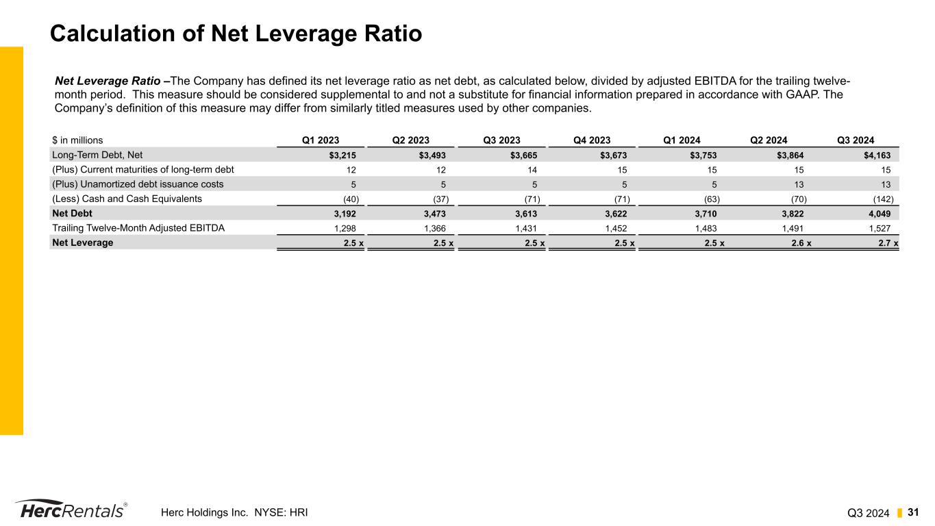 Q3 2024Herc Holdings Inc. NYSE: HRI 31 Calculation of Net Leverage Ratio $ in millions Q1 2023 Q2 2023 Q3 2023 Q4 2023 Q1 2024 Q2 2024 Q3 2024 Long-Term Debt, Net $3,215 $3,493 $3,665 $3,673 $3,753 $3,864 $4,163 (Plus) Current maturities of long-term debt 12 12 14 15 15 15 15 (Plus) Unamortized debt issuance costs 5 5 5 5 5 13 13 (Less) Cash and Cash Equivalents (40) (37) (71) (71) (63) (70) (142) Net Debt 3,192 3,473 3,613 3,622 3,710 3,822 4,049 Trailing Twelve-Month Adjusted EBITDA 1,298 1,366 1,431 1,452 1,483 1,491 1,527 Net Leverage 2.5 x 2.5 x 2.5 x 2.5 x 2.5 x 2.6 x 2.7 x Net Leverage Ratio –The Company has defined its net leverage ratio as net debt, as calculated below, divided by adjusted EBITDA for the trailing twelve- month period. This measure should be considered supplemental to and not a substitute for financial information prepared in accordance with GAAP. The Company’s definition of this measure may differ from similarly titled measures used by other companies.