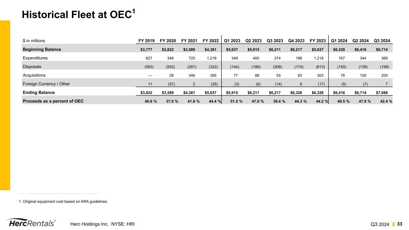 Q3 2024Herc Holdings Inc. NYSE: HRI 33 Historical Fleet at OEC1 $ in millions FY 2019 FY 2020 FY 2021 FY 2022 Q1 2023 Q2 2023 Q3 2023 Q4 2023 FY 2023 Q1 2024 Q2 2024 Q3 2024 Beginning Balance $3,777 $3,822 $3,589 $4,381 $5,637 $5,915 $6,211 $6,217 $5,637 $6,328 $6,416 $6,714 Expenditures 627 348 725 1,218 348 400 274 196 1,218 167 344 366 Disposals (593) (552) (281) (322) (144) (186) (309) (174) (813) (150) (139) (199) Acquisitions — 28 346 395 77 88 55 83 303 76 100 200 Foreign Currency / Other 11 (57) 2 (35) (3) (6) (14) 6 (17) (5) (7) 7 Ending Balance $3,822 $3,589 $4,381 $5,637 $5,915 $6,211 $6,217 $6,328 $6,328 $6,416 $6,714 $7,088 Proceeds as a percent of OEC 40.9 % 37.0 % 41.8 % 44.4 % 51.5 % 47.0 % 39.4 % 44.3 % 44.2 % 49.5 % 47.9 % 42.4 % 1. Original equipment cost based on ARA guidelines.