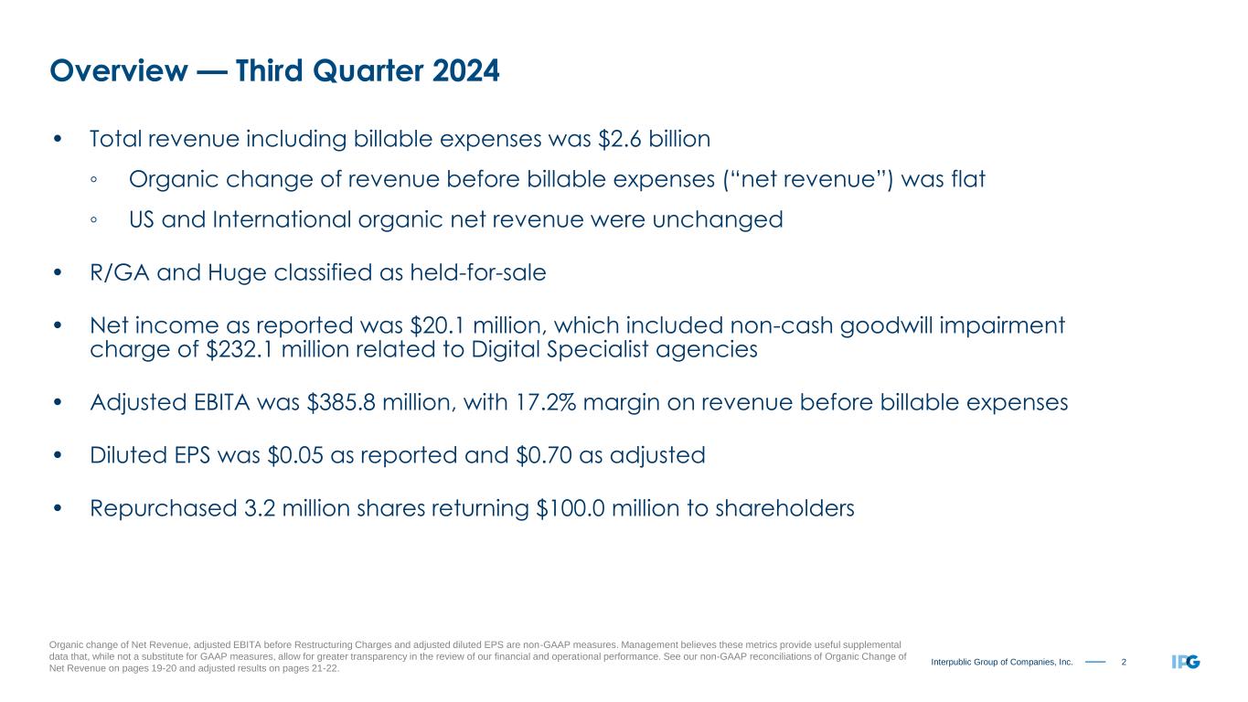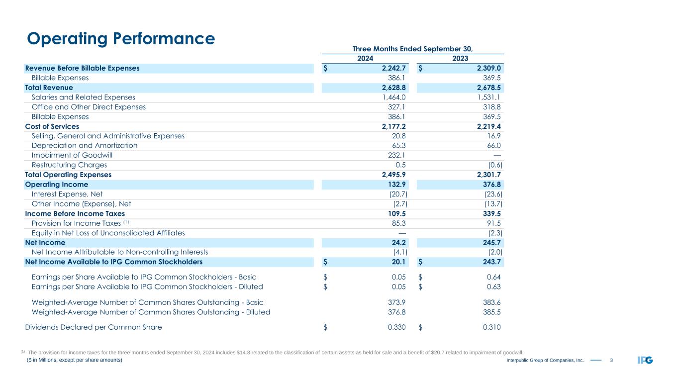 2Interpublic Group of Companies, Inc. Organic change of Net Revenue, adjusted EBITA before Restructuring Charges and adjusted diluted EPS are non-GAAP measures. Management believes these metrics provide useful supplemental data that, while not a substitute for GAAP measures, allow for greater transparency in the review of our financial and operational performance. See our non-GAAP reconciliations of Organic Change of Net Revenue on pages 19-20 and adjusted results on pages 21-22. • Total revenue including billable expenses was $2.6 billion ◦ Organic change of revenue before billable expenses (“net revenue”) was flat ◦ US and International organic net revenue were unchanged • R/GA and Huge classified as held-for-sale • Net income as reported was $20.1 million, which included non-cash goodwill impairment charge of $232.1 million related to Digital Specialist agencies • Adjusted EBITA was $385.8 million, with 17.2% margin on revenue before billable expenses • Diluted EPS was $0.05 as reported and $0.70 as adjusted • Repurchased 3.2 million shares returning $100.0 million to shareholders Overview — Third Quarter 2024