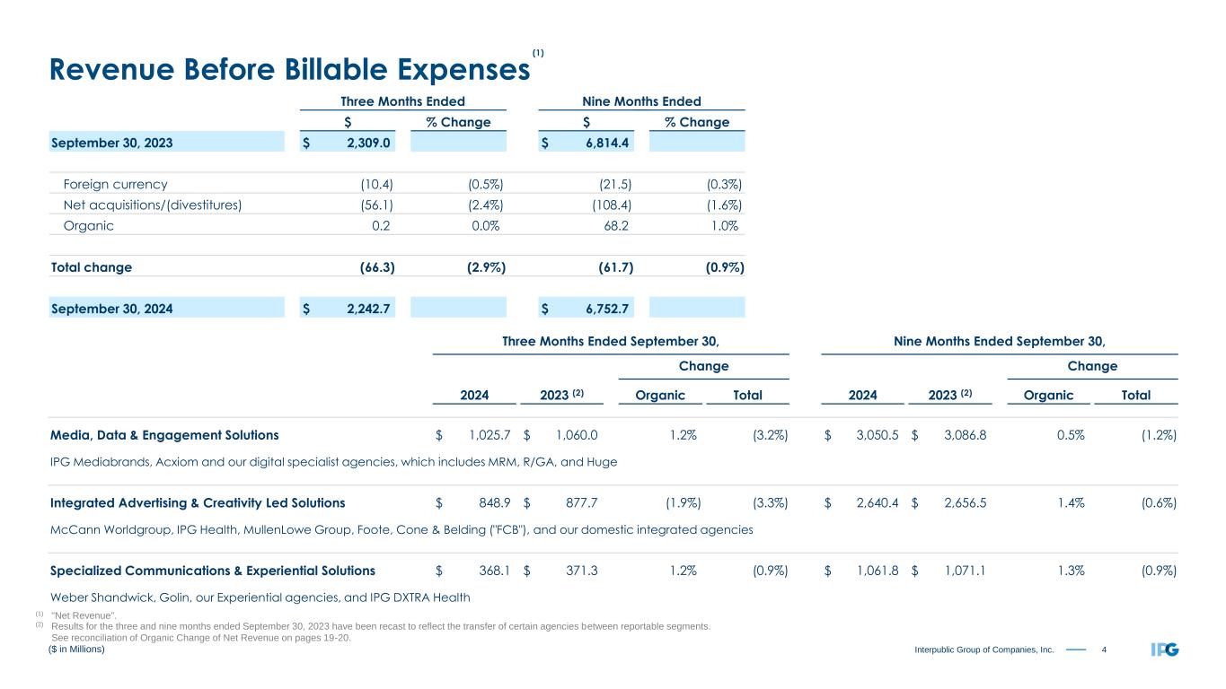 3Interpublic Group of Companies, Inc. Three Months Ended September 30, 2024 2023 Revenue Before Billable Expenses $ 2,242.7 $ 2,309.0 Billable Expenses 386.1 369.5 Total Revenue 2,628.8 2,678.5 Salaries and Related Expenses 1,464.0 1,531.1 Office and Other Direct Expenses 327.1 318.8 Billable Expenses 386.1 369.5 Cost of Services 2,177.2 2,219.4 Selling, General and Administrative Expenses 20.8 16.9 Depreciation and Amortization 65.3 66.0 Impairment of Goodwill 232.1 — Restructuring Charges 0.5 (0.6) Total Operating Expenses 2,495.9 2,301.7 Operating Income 132.9 376.8 Interest Expense, Net (20.7) (23.6) Other Income (Expense), Net (2.7) (13.7) Income Before Income Taxes 109.5 339.5 Provision for Income Taxes (1) 85.3 91.5 Equity in Net Loss of Unconsolidated Affiliates — (2.3) Net Income 24.2 245.7 Net Income Attributable to Non-controlling Interests (4.1) (2.0) Net Income Available to IPG Common Stockholders $ 20.1 $ 243.7 Earnings per Share Available to IPG Common Stockholders - Basic $ 0.05 $ 0.64 Earnings per Share Available to IPG Common Stockholders - Diluted $ 0.05 $ 0.63 Weighted-Average Number of Common Shares Outstanding - Basic 373.9 383.6 Weighted-Average Number of Common Shares Outstanding - Diluted 376.8 385.5 Dividends Declared per Common Share $ 0.330 $ 0.310 ($ in Millions, except per share amounts) Operating Performance (1) The provision for income taxes for the three months ended September 30, 2024 includes $14.8 related to the classification of certain assets as held for sale and a benefit of $20.7 related to impairment of goodwill.