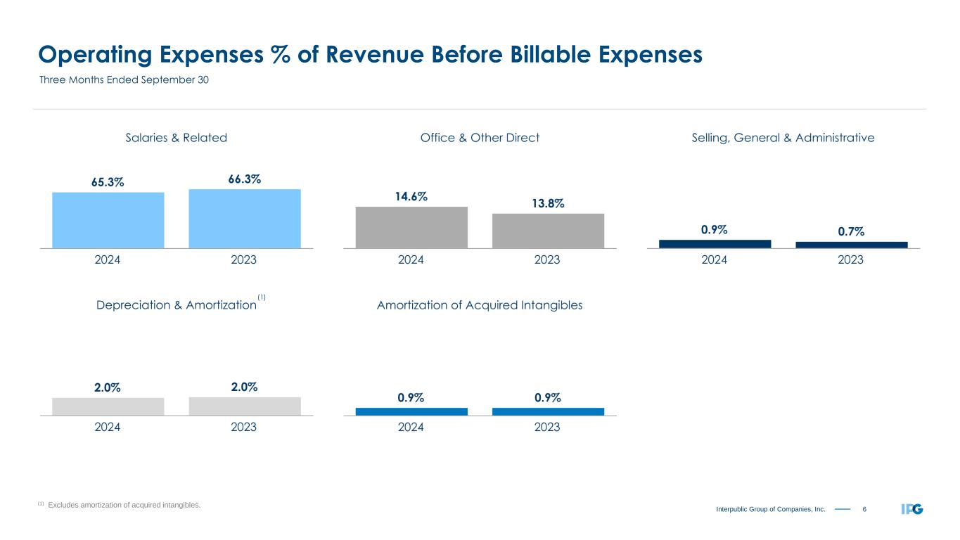 5Interpublic Group of Companies, Inc. Organic Change of Net Revenue by Region Three Months Ended September 30, 2024 0.0% United States -0.7% United Kingdom +0.6% Continental Europe +9.8% Latin America -7.4% Asia Pacific unchanged International unchanged Worldwide +1.5% All Other Markets “All Other Markets” includes Canada, the Middle East and Africa. Circle proportions represent consolidated Net Revenue distribution. See reconciliation of Organic Change of Net Revenue, including total Net Revenue change, on page 19.