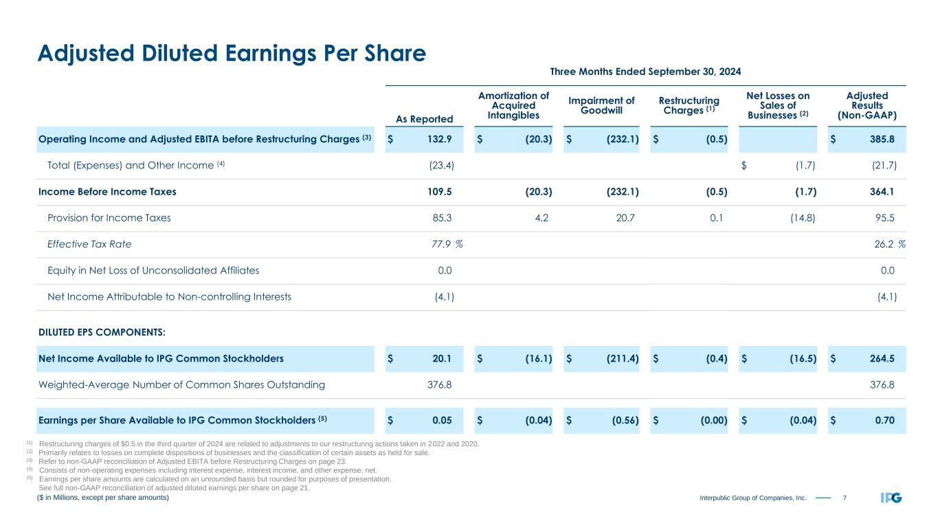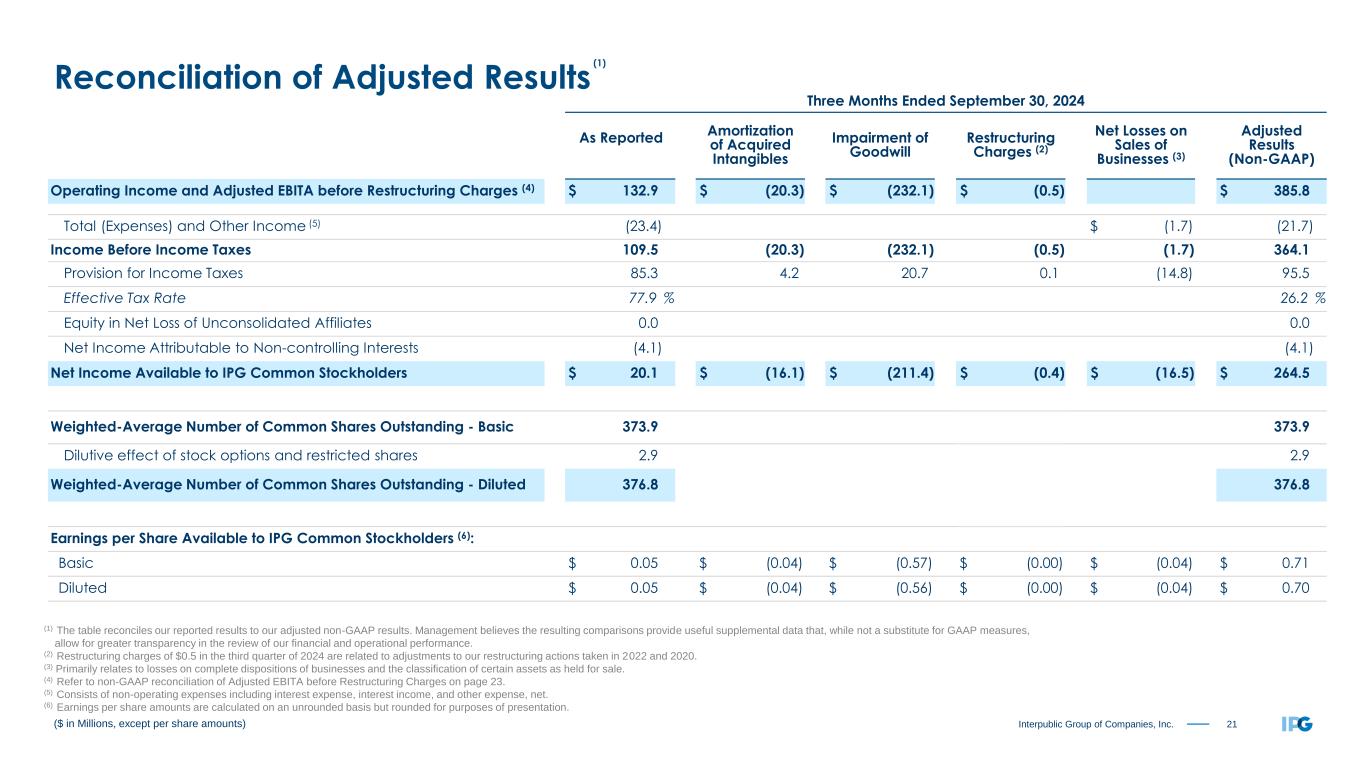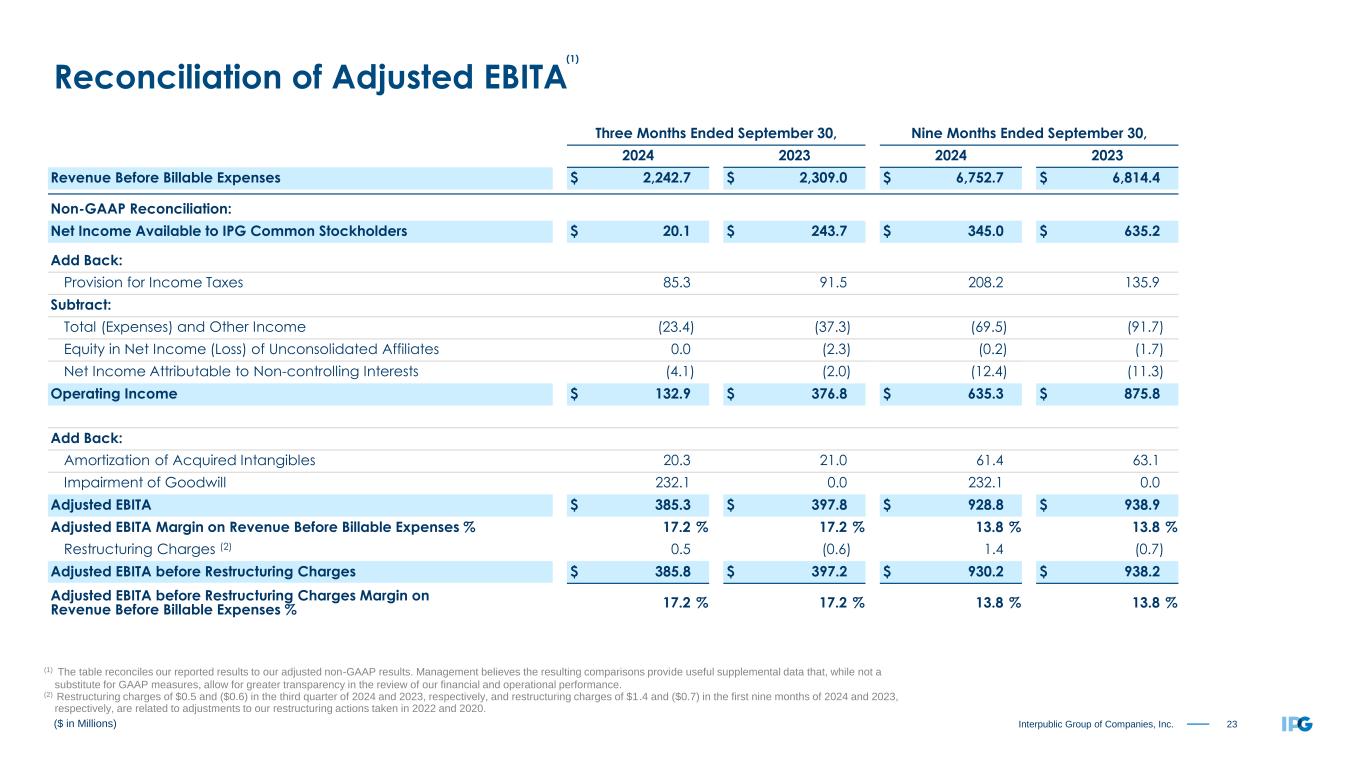 22Interpublic Group of Companies, Inc. ($ in Millions, except per share amounts) Reconciliation of Adjusted Results (1) (1) The table reconciles our reported results to our adjusted non-GAAP results. Management believes the resulting comparisons provide useful supplemental data that, while not a substitute for GAAP measures, allow for greater transparency in the review of our financial and operational performance. (2) Restructuring charges of $1.4 in the first nine months of 2024 represent adjustments to our restructuring actions taken in 2022 and 2020. (3) Primarily relates to losses on complete dispositions of businesses and the classification of certain assets as held for sale. (4) Refer to non-GAAP reconciliation of Adjusted EBITA before Restructuring Charges on page 23. (5) Consists of non-operating expenses including interest expense, interest income, and other expense, net. (6) Earnings per share amounts are calculated on an unrounded basis but rounded for purposes of presentation. Nine Months Ended September 30, 2024 As Reported Amortization of Acquired Intangibles Impairment of Goodwill Restructuring Charges (2) Net Losses on Sales of Businesses (3) Adjusted Results (Non-GAAP) Operating Income and Adjusted EBITA before Restructuring Charges (4) $ 635.3 $ (61.4) $ (232.1) $ (1.4) $ 930.2 Total (Expenses) and Other Income (5) (69.5) $ (6.4) (63.1) Income Before Income Taxes 565.8 (61.4) (232.1) (1.4) (6.4) 867.1 Provision for Income Taxes 208.2 12.6 20.7 0.3 (16.5) 225.3 Effective Tax Rate 36.8 % 26.0 % Equity in Net Loss of Unconsolidated Affiliates (0.2) (0.2) Net Income Attributable to Non-controlling Interests (12.4) (12.4) Net Income Available to IPG Common Stockholders $ 345.0 $ (48.8) $ (211.4) $ (1.1) $ (22.9) $ 629.2 Weighted-Average Number of Common Shares Outstanding - Basic 376.2 376.2 Dilutive effect of stock options and restricted shares 2.5 2.5 Weighted-Average Number of Common Shares Outstanding - Diluted 378.7 378.7 Earnings per Share Available to IPG Common Stockholders (6): Basic $ 0.92 $ (0.13) $ (0.56) $ (0.00) $ (0.06) $ 1.67 Diluted $ 0.91 $ (0.13) $ (0.56) $ (0.00) $ (0.06) $ 1.66