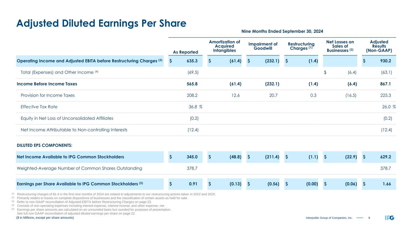 7Interpublic Group of Companies, Inc. Three Months Ended September 30, 2024 As Reported Amortization of Acquired Intangibles Impairment of Goodwill Restructuring Charges (1) Net Losses on Sales of Businesses (2) Adjusted Results (Non-GAAP) Operating Income and Adjusted EBITA before Restructuring Charges (3) $ 132.9 $ (20.3) $ (232.1) $ (0.5) $ 385.8 Total (Expenses) and Other Income (4) (23.4) $ (1.7) (21.7) Income Before Income Taxes 109.5 (20.3) (232.1) (0.5) (1.7) 364.1 Provision for Income Taxes 85.3 4.2 20.7 0.1 (14.8) 95.5 Effective Tax Rate 77.9 % 26.2 % Equity in Net Loss of Unconsolidated Affiliates 0.0 0.0 Net Income Attributable to Non-controlling Interests (4.1) (4.1) DILUTED EPS COMPONENTS: Net Income Available to IPG Common Stockholders $ 20.1 $ (16.1) $ (211.4) $ (0.4) $ (16.5) $ 264.5 Weighted-Average Number of Common Shares Outstanding 376.8 376.8 Earnings per Share Available to IPG Common Stockholders (5) $ 0.05 $ (0.04) $ (0.56) $ (0.00) $ (0.04) $ 0.70 ($ in Millions, except per share amounts) (1) Restructuring charges of $0.5 in the third quarter of 2024 are related to adjustments to our restructuring actions taken in 2022 and 2020. (2) Primarily relates to losses on complete dispositions of businesses and the classification of certain assets as held for sale. (3) Refer to non-GAAP reconciliation of Adjusted EBITA before Restructuring Charges on page 23. (4) Consists of non-operating expenses including interest expense, interest income, and other expense, net. (5) Earnings per share amounts are calculated on an unrounded basis but rounded for purposes of presentation. See full non-GAAP reconciliation of adjusted diluted earnings per share on page 21. Adjusted Diluted Earnings Per Share