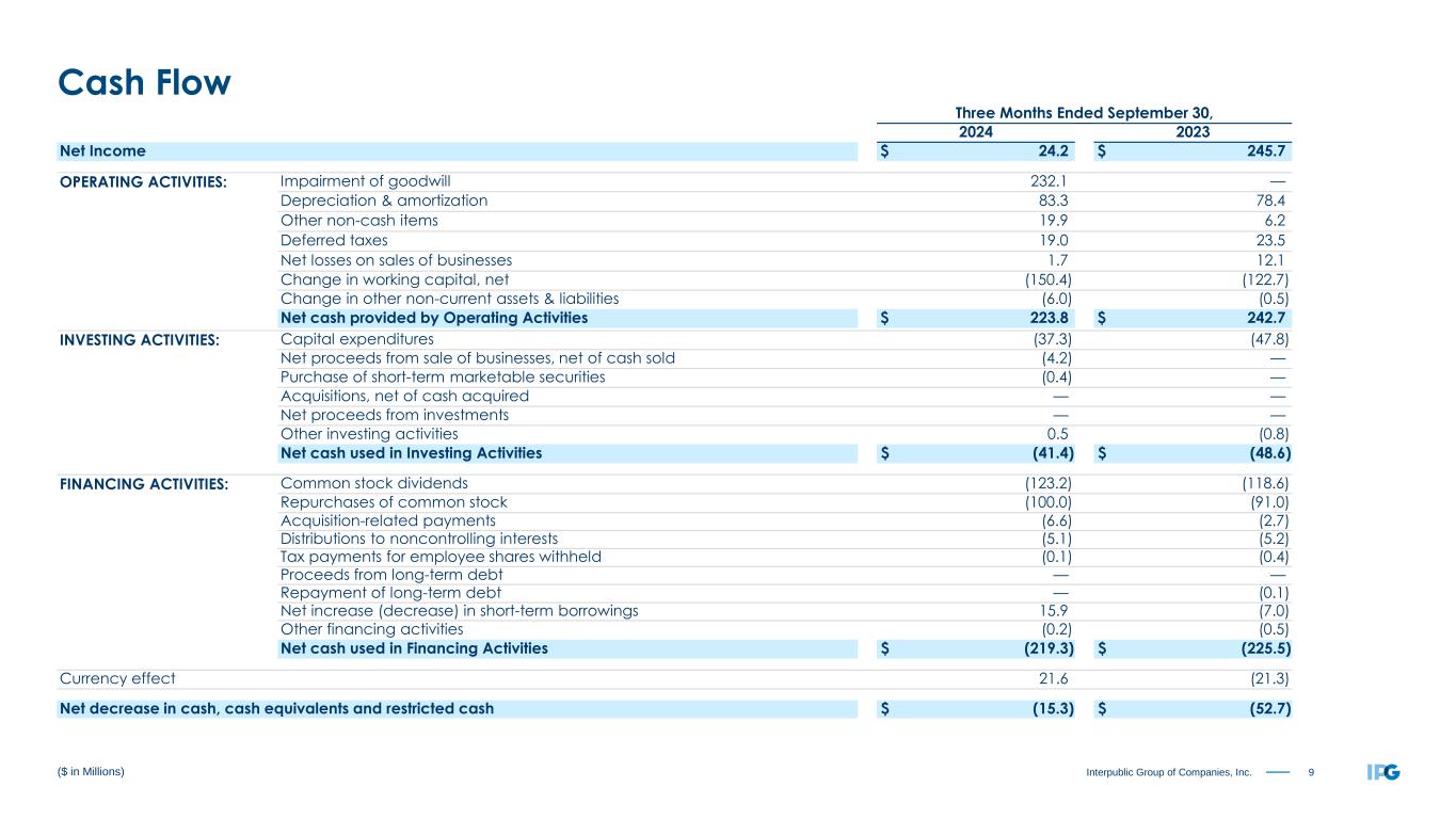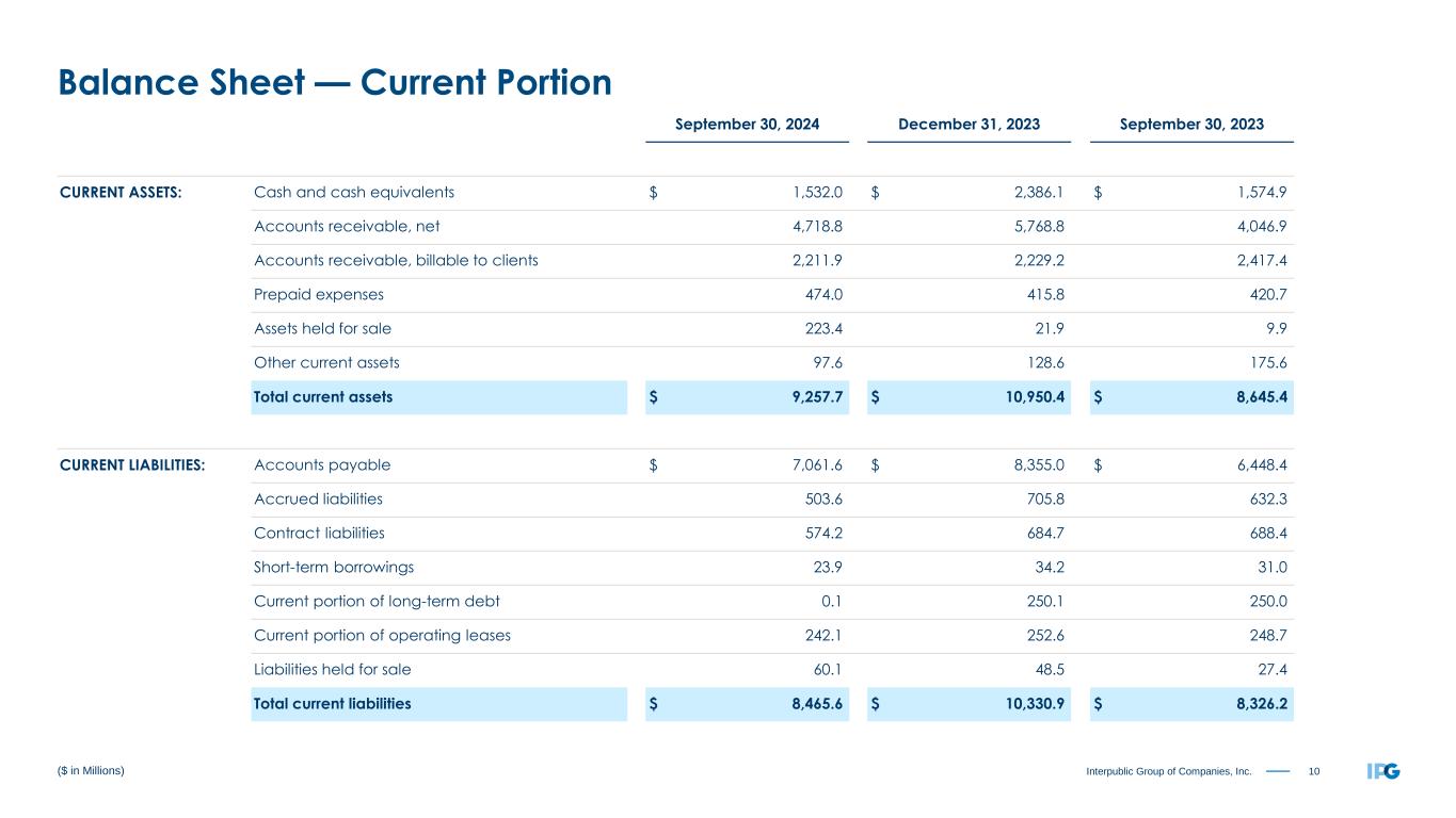 9Interpublic Group of Companies, Inc. Three Months Ended September 30, 2024 2023 Net Income $ 24.2 $ 245.7 OPERATING ACTIVITIES: Impairment of goodwill 232.1 — Depreciation & amortization 83.3 78.4 Other non-cash items 19.9 6.2 Deferred taxes 19.0 23.5 Net losses on sales of businesses 1.7 12.1 Change in working capital, net (150.4) (122.7) Change in other non-current assets & liabilities (6.0) (0.5) Net cash provided by Operating Activities $ 223.8 $ 242.7 INVESTING ACTIVITIES: Capital expenditures (37.3) (47.8) Net proceeds from sale of businesses, net of cash sold (4.2) — Purchase of short-term marketable securities (0.4) — Acquisitions, net of cash acquired — — Net proceeds from investments — — Other investing activities 0.5 (0.8) Net cash used in Investing Activities $ (41.4) $ (48.6) FINANCING ACTIVITIES: Common stock dividends (123.2) (118.6) Repurchases of common stock (100.0) (91.0) Acquisition-related payments (6.6) (2.7) Distributions to noncontrolling interests (5.1) (5.2) Tax payments for employee shares withheld (0.1) (0.4) Proceeds from long-term debt — — Repayment of long-term debt — (0.1) Net increase (decrease) in short-term borrowings 15.9 (7.0) Other financing activities (0.2) (0.5) Net cash used in Financing Activities $ (219.3) $ (225.5) Currency effect 21.6 (21.3) Net decrease in cash, cash equivalents and restricted cash $ (15.3) $ (52.7) ($ in Millions) Cash Flow