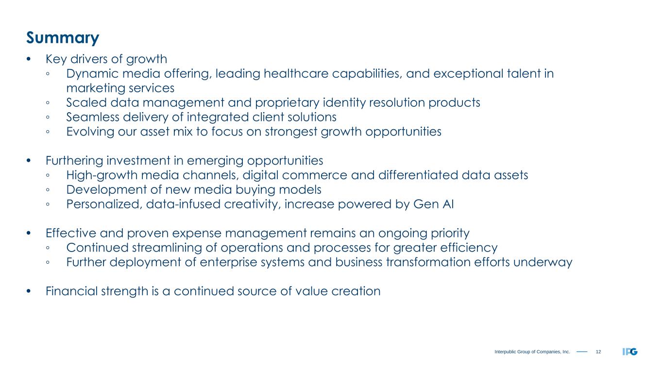 12Interpublic Group of Companies, Inc. Summary • Key drivers of growth ◦ Dynamic media offering, leading healthcare capabilities, and exceptional talent in marketing services ◦ Scaled data management and proprietary identity resolution products ◦ Seamless delivery of integrated client solutions ◦ Evolving our asset mix to focus on strongest growth opportunities • Furthering investment in emerging opportunities ◦ High-growth media channels, digital commerce and differentiated data assets ◦ Development of new media buying models ◦ Personalized, data-infused creativity, increase powered by Gen AI • Effective and proven expense management remains an ongoing priority ◦ Continued streamlining of operations and processes for greater efficiency ◦ Further deployment of enterprise systems and business transformation efforts underway • Financial strength is a continued source of value creation