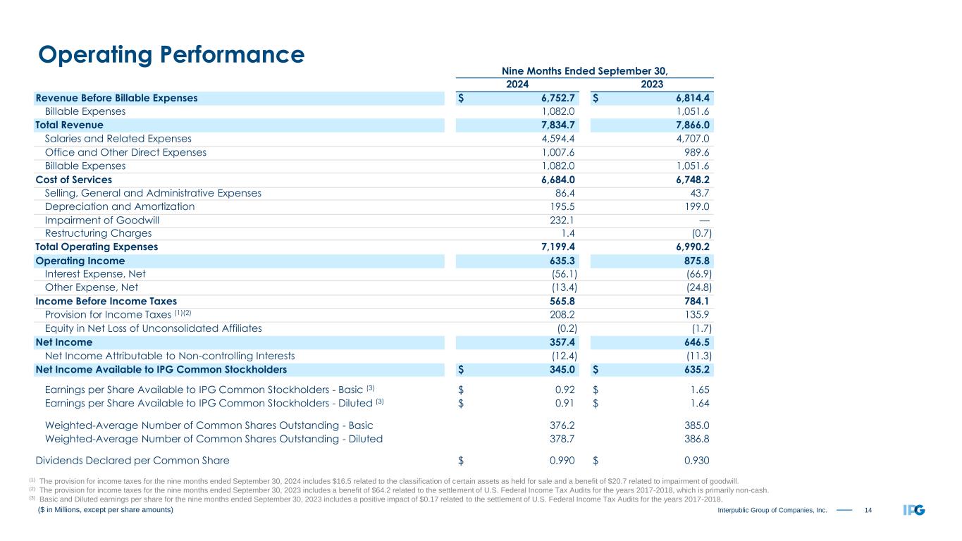 14Interpublic Group of Companies, Inc. Nine Months Ended September 30, 2024 2023 Revenue Before Billable Expenses $ 6,752.7 $ 6,814.4 Billable Expenses 1,082.0 1,051.6 Total Revenue 7,834.7 7,866.0 Salaries and Related Expenses 4,594.4 4,707.0 Office and Other Direct Expenses 1,007.6 989.6 Billable Expenses 1,082.0 1,051.6 Cost of Services 6,684.0 6,748.2 Selling, General and Administrative Expenses 86.4 43.7 Depreciation and Amortization 195.5 199.0 Impairment of Goodwill 232.1 — Restructuring Charges 1.4 (0.7) Total Operating Expenses 7,199.4 6,990.2 Operating Income 635.3 875.8 Interest Expense, Net (56.1) (66.9) Other Expense, Net (13.4) (24.8) Income Before Income Taxes 565.8 784.1 Provision for Income Taxes (1)(2) 208.2 135.9 Equity in Net Loss of Unconsolidated Affiliates (0.2) (1.7) Net Income 357.4 646.5 Net Income Attributable to Non-controlling Interests (12.4) (11.3) Net Income Available to IPG Common Stockholders $ 345.0 $ 635.2 Earnings per Share Available to IPG Common Stockholders - Basic (3) $ 0.92 $ 1.65 Earnings per Share Available to IPG Common Stockholders - Diluted (3) $ 0.91 $ 1.64 Weighted-Average Number of Common Shares Outstanding - Basic 376.2 385.0 Weighted-Average Number of Common Shares Outstanding - Diluted 378.7 386.8 Dividends Declared per Common Share $ 0.990 $ 0.930 ($ in Millions, except per share amounts) Operating Performance (1) The provision for income taxes for the nine months ended September 30, 2024 includes $16.5 related to the classification of certain assets as held for sale and a benefit of $20.7 related to impairment of goodwill. (2) The provision for income taxes for the nine months ended September 30, 2023 includes a benefit of $64.2 related to the settlement of U.S. Federal Income Tax Audits for the years 2017-2018, which is primarily non-cash. (3) Basic and Diluted earnings per share for the nine months ended September 30, 2023 includes a positive impact of $0.17 related to the settlement of U.S. Federal Income Tax Audits for the years 2017-2018.