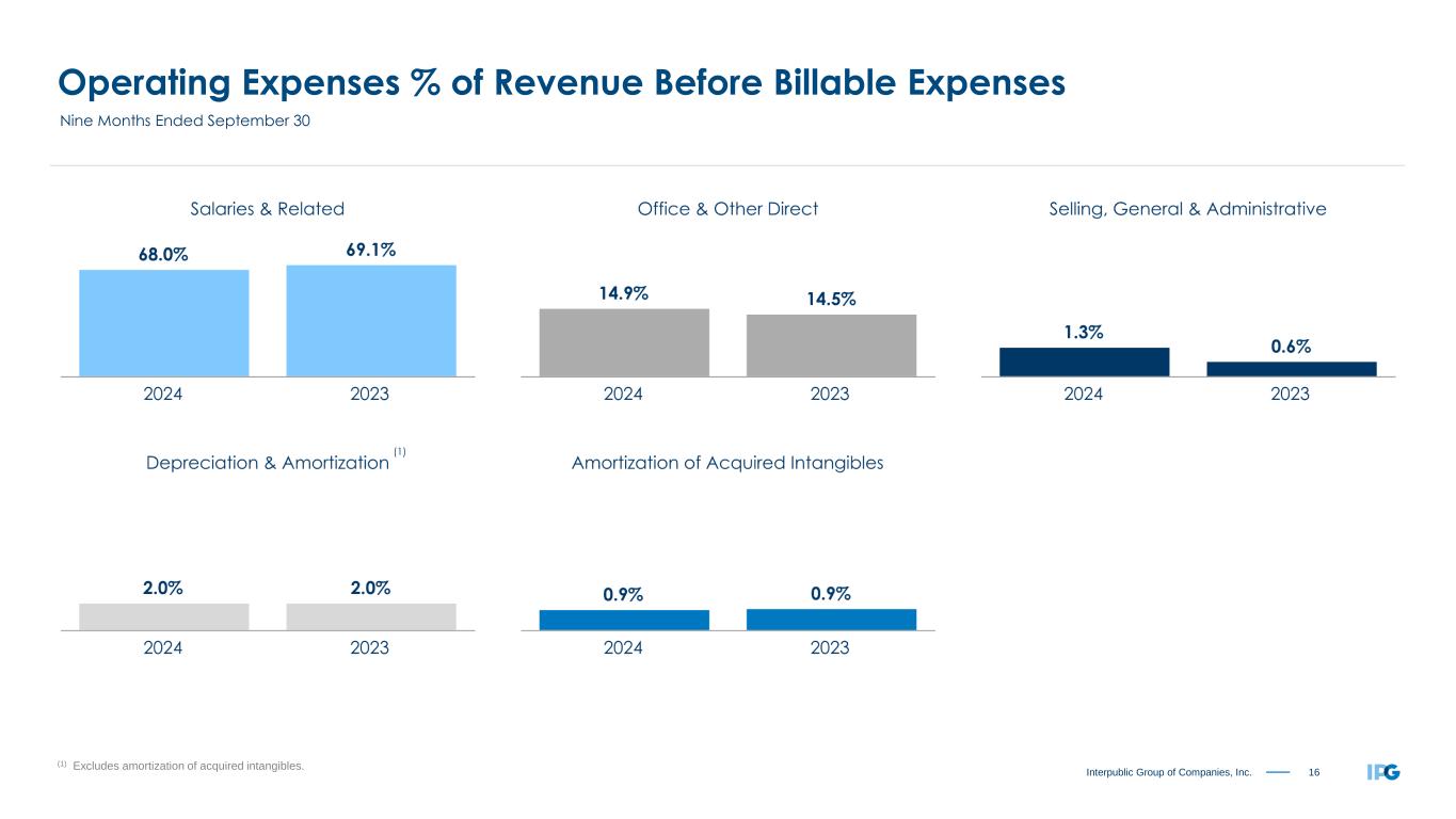15Interpublic Group of Companies, Inc. Organic Change of Net Revenue by Region “All Other Markets” includes Canada, the Middle East and Africa. Circle proportions represent consolidated Net Revenue distribution. See reconciliation of Organic Change of Net Revenue, including total Net Revenue change, on page 20. Nine Months Ended September 30, 2024 +1.1% United States +1.0% United Kingdom +5.2% Continental Europe +5.9% Latin America -5.9% Asia Pacific +0.7% International +1.0% Worldwide -1.1% All Other Markets