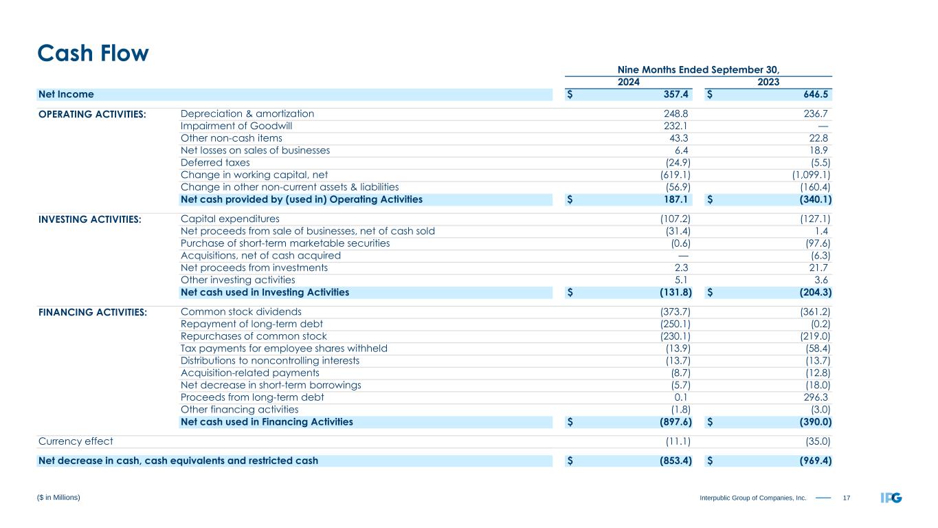 17Interpublic Group of Companies, Inc. Nine Months Ended September 30, 2024 2023 Net Income $ 357.4 $ 646.5 OPERATING ACTIVITIES: Depreciation & amortization 248.8 236.7 Impairment of Goodwill 232.1 — Other non-cash items 43.3 22.8 Net losses on sales of businesses 6.4 18.9 Deferred taxes (24.9) (5.5) Change in working capital, net (619.1) (1,099.1) Change in other non-current assets & liabilities (56.9) (160.4) Net cash provided by (used in) Operating Activities $ 187.1 $ (340.1) INVESTING ACTIVITIES: Capital expenditures (107.2) (127.1) Net proceeds from sale of businesses, net of cash sold (31.4) 1.4 Purchase of short-term marketable securities (0.6) (97.6) Acquisitions, net of cash acquired — (6.3) Net proceeds from investments 2.3 21.7 Other investing activities 5.1 3.6 Net cash used in Investing Activities $ (131.8) $ (204.3) FINANCING ACTIVITIES: Common stock dividends (373.7) (361.2) Repayment of long-term debt (250.1) (0.2) Repurchases of common stock (230.1) (219.0) Tax payments for employee shares withheld (13.9) (58.4) Distributions to noncontrolling interests (13.7) (13.7) Acquisition-related payments (8.7) (12.8) Net decrease in short-term borrowings (5.7) (18.0) Proceeds from long-term debt 0.1 296.3 Other financing activities (1.8) (3.0) Net cash used in Financing Activities $ (897.6) $ (390.0) Currency effect (11.1) (35.0) Net decrease in cash, cash equivalents and restricted cash $ (853.4) $ (969.4) ($ in Millions) Cash Flow