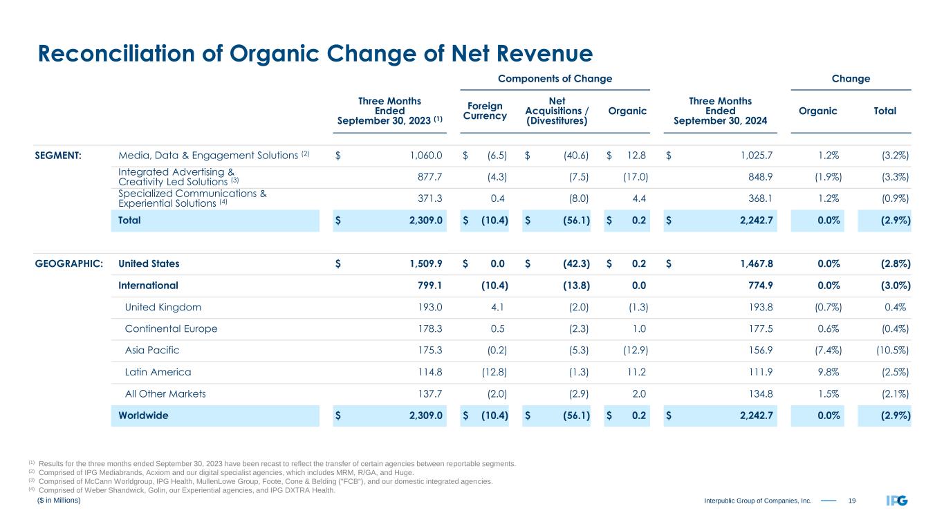 20Interpublic Group of Companies, Inc. ($ in Millions) Components of Change Change Nine Months Ended September 30, 2023 (1) Foreign Currency Net Acquisitions / (Divestitures) Organic Nine Months Ended September 30, 2024 Organic Total SEGMENT: Media, Data & Engagement Solutions (2) $ 3,086.8 $ (12.1) (40.6) $ 16.4 $ 3,050.5 0.5% (1.2%) Integrated Advertising & Creativity Led Solutions (3) 2,656.5 (10.3) (43.7) 37.9 2,640.4 1.4% (0.6%) Specialized Communications & Experiential Solutions (4) 1,071.1 0.9 (24.1) 13.9 1,061.8 1.3% (0.9%) Total $ 6,814.4 $ (21.5) $ (108.4) $ 68.2 $ 6,752.7 1.0% (0.9%) GEOGRAPHIC: United States $ 4,512.3 $ 0.0 $ (94.1) $ 51.4 $ 4,469.6 1.1% (0.9%) International 2,302.1 (21.5) (14.3) 16.8 2,283.1 0.7% (0.8%) United Kingdom 548.1 14.0 (2.0) 5.4 565.5 1.0% 3.2% Continental Europe 534.5 (0.8) (5.3) 27.8 556.2 5.2% 4.1% Asia Pacific 511.8 (12.0) (2.8) (30.0) 467.0 (5.9%) (8.8%) Latin America 301.9 (17.3) (1.3) 17.9 301.2 5.9% (0.2%) All Other Markets 405.8 (5.4) (2.9) (4.3) 393.2 (1.1%) (3.1%) Worldwide $ 6,814.4 $ (21.5) $ (108.4) $ 68.2 $ 6,752.7 1.0% (0.9%) Reconciliation of Organic Change of Net Revenue (1) Results for the nine months ended September 30, 2023 have been recast to reflect the transfer of certain agencies between reportable segments. (2) Comprised of IPG Mediabrands, Acxiom and our digital specialist agencies, which includes MRM, R/GA, and Huge. (3) Comprised of McCann Worldgroup, IPG Health, MullenLowe Group, Foote, Cone & Belding ("FCB"), and our domestic integrated agencies. (4) Comprised of Weber Shandwick, Golin, our Experiential agencies, and IPG DXTRA Health.
