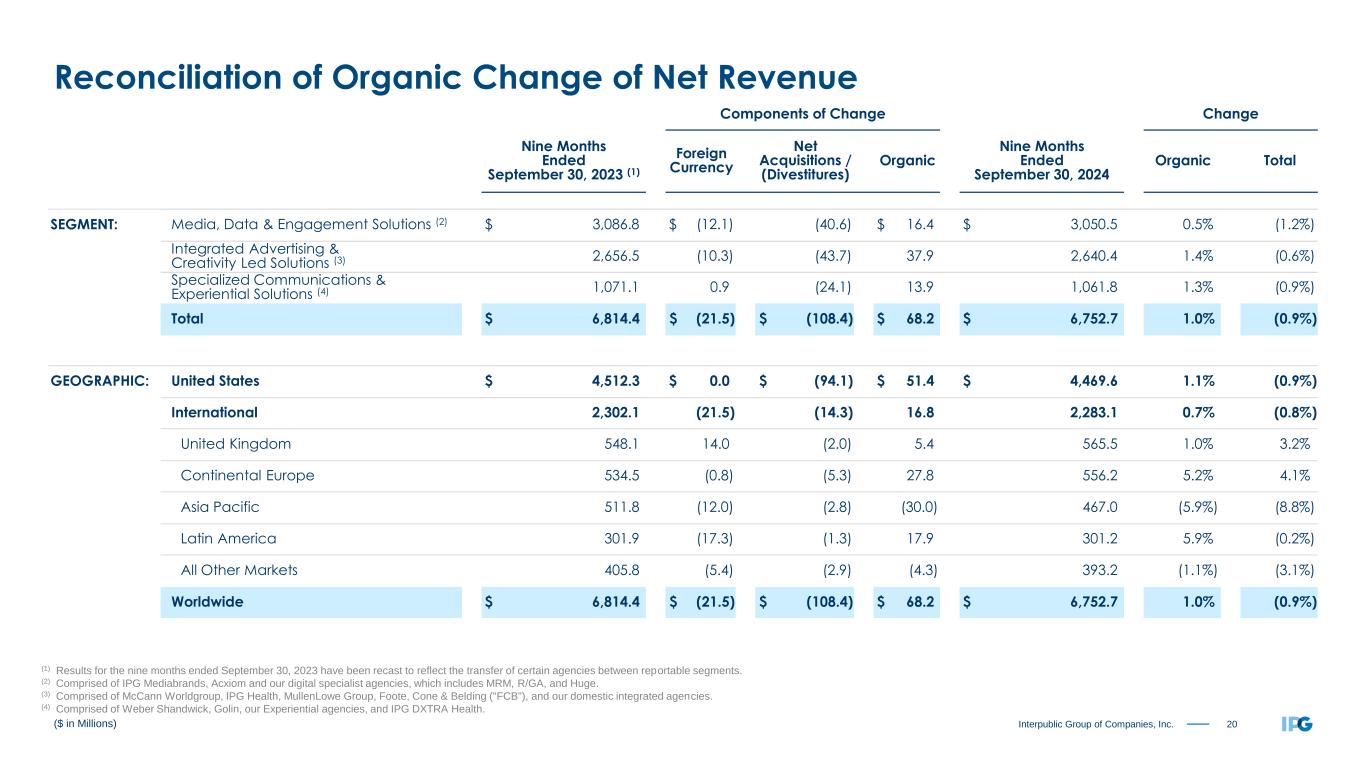19Interpublic Group of Companies, Inc. Components of Change Change Three Months Ended September 30, 2023 (1) Foreign Currency Net Acquisitions / (Divestitures) Organic Three Months Ended September 30, 2024 Organic Total SEGMENT: Media, Data & Engagement Solutions (2) $ 1,060.0 $ (6.5) $ (40.6) $ 12.8 $ 1,025.7 1.2% (3.2%) Integrated Advertising & Creativity Led Solutions (3) 877.7 (4.3) (7.5) (17.0) 848.9 (1.9%) (3.3%) Specialized Communications & Experiential Solutions (4) 371.3 0.4 (8.0) 4.4 368.1 1.2% (0.9%) Total $ 2,309.0 $ (10.4) $ (56.1) $ 0.2 $ 2,242.7 0.0% (2.9%) GEOGRAPHIC: United States $ 1,509.9 $ 0.0 $ (42.3) $ 0.2 $ 1,467.8 0.0% (2.8%) International 799.1 (10.4) (13.8) 0.0 774.9 0.0% (3.0%) United Kingdom 193.0 4.1 (2.0) (1.3) 193.8 (0.7%) 0.4% Continental Europe 178.3 0.5 (2.3) 1.0 177.5 0.6% (0.4%) Asia Pacific 175.3 (0.2) (5.3) (12.9) 156.9 (7.4%) (10.5%) Latin America 114.8 (12.8) (1.3) 11.2 111.9 9.8% (2.5%) All Other Markets 137.7 (2.0) (2.9) 2.0 134.8 1.5% (2.1%) Worldwide $ 2,309.0 $ (10.4) $ (56.1) $ 0.2 $ 2,242.7 0.0% (2.9%) ($ in Millions) Reconciliation of Organic Change of Net Revenue (1) Results for the three months ended September 30, 2023 have been recast to reflect the transfer of certain agencies between reportable segments. (2) Comprised of IPG Mediabrands, Acxiom and our digital specialist agencies, which includes MRM, R/GA, and Huge. (3) Comprised of McCann Worldgroup, IPG Health, MullenLowe Group, Foote, Cone & Belding ("FCB"), and our domestic integrated agencies. (4) Comprised of Weber Shandwick, Golin, our Experiential agencies, and IPG DXTRA Health.