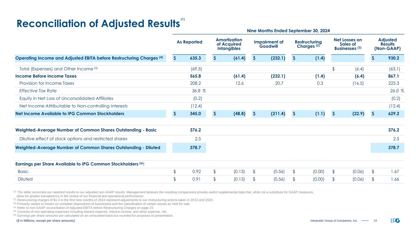 21Interpublic Group of Companies, Inc. Three Months Ended September 30, 2024 As Reported Amortization of Acquired Intangibles Impairment of Goodwill Restructuring Charges (2) Net Losses on Sales of Businesses (3) Adjusted Results (Non-GAAP) Operating Income and Adjusted EBITA before Restructuring Charges (4) $ 132.9 $ (20.3) $ (232.1) $ (0.5) $ 385.8 Total (Expenses) and Other Income (5) (23.4) $ (1.7) (21.7) Income Before Income Taxes 109.5 (20.3) (232.1) (0.5) (1.7) 364.1 Provision for Income Taxes 85.3 4.2 20.7 0.1 (14.8) 95.5 Effective Tax Rate 77.9 % 26.2 % Equity in Net Loss of Unconsolidated Affiliates 0.0 0.0 Net Income Attributable to Non-controlling Interests (4.1) (4.1) Net Income Available to IPG Common Stockholders $ 20.1 $ (16.1) $ (211.4) $ (0.4) $ (16.5) $ 264.5 Weighted-Average Number of Common Shares Outstanding - Basic 373.9 373.9 Dilutive effect of stock options and restricted shares 2.9 2.9 Weighted-Average Number of Common Shares Outstanding - Diluted 376.8 376.8 Earnings per Share Available to IPG Common Stockholders (6): Basic $ 0.05 $ (0.04) $ (0.57) $ (0.00) $ (0.04) $ 0.71 Diluted $ 0.05 $ (0.04) $ (0.56) $ (0.00) $ (0.04) $ 0.70 ($ in Millions, except per share amounts) (1) The table reconciles our reported results to our adjusted non-GAAP results. Management believes the resulting comparisons provide useful supplemental data that, while not a substitute for GAAP measures, allow for greater transparency in the review of our financial and operational performance. (2) Restructuring charges of $0.5 in the third quarter of 2024 are related to adjustments to our restructuring actions taken in 2022 and 2020. (3) Primarily relates to losses on complete dispositions of businesses and the classification of certain assets as held for sale. (4) Refer to non-GAAP reconciliation of Adjusted EBITA before Restructuring Charges on page 23. (5) Consists of non-operating expenses including interest expense, interest income, and other expense, net. (6) Earnings per share amounts are calculated on an unrounded basis but rounded for purposes of presentation. Reconciliation of Adjusted Results (1)