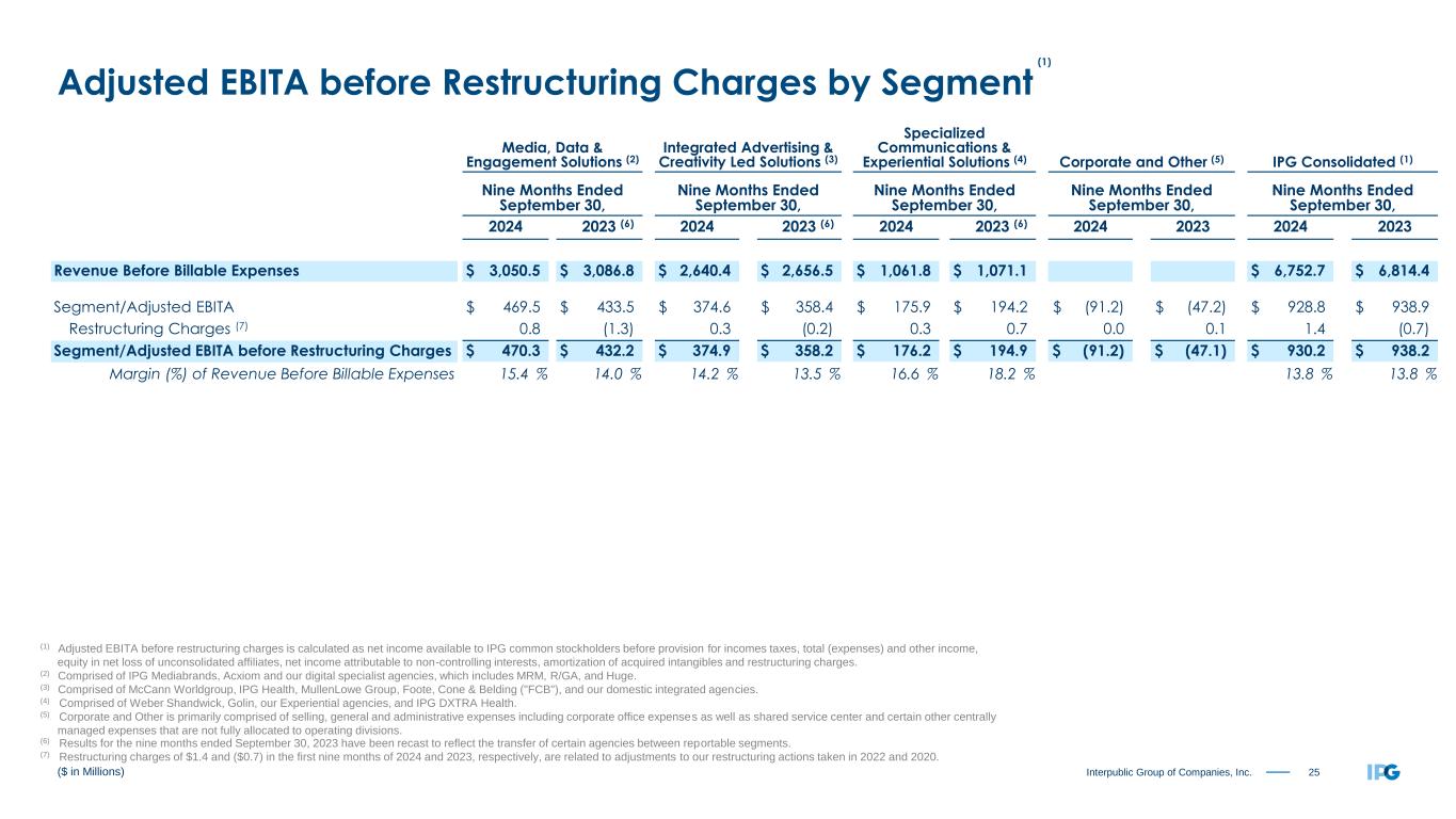 24Interpublic Group of Companies, Inc. Media, Data & Engagement Solutions (2) Integrated Advertising & Creativity Led Solutions (3) Specialized Communications & Experiential Solutions (4) Corporate and Other (5) IPG Consolidated (1) Three Months Ended September 30, Three Months Ended September 30, Three Months Ended September 30, Three Months Ended September 30, Three Months Ended September 30, 2024 2023 (6) 2024 2023 (6) 2024 2023 (6) 2024 2023 2024 2023 Revenue Before Billable Expenses $ 1,025.7 $ 1,060.0 $ 848.9 $ 877.7 $ 368.1 $ 371.3 $ 2,242.7 $ 2,309.0 Segment/Adjusted EBITA $ 194.9 $ 209.1 $ 134.0 $ 129.3 $ 78.5 $ 77.7 $ (22.1) $ (18.3) $ 385.3 $ 397.8 Restructuring Charges (7) 0.5 (0.1) 0.0 (0.5) 0.0 (0.2) 0.0 0.2 0.5 (0.6) Segment/Adjusted EBITA before Restructuring Charges $ 195.4 $ 209.0 $ 134.0 $ 128.8 $ 78.5 $ 77.5 $ (22.1) $ (18.1) $ 385.8 $ 397.2 Margin (%) of Revenue Before Billable Expenses 19.1 % 19.7 % 15.8 % 14.7 % 21.3 % 20.9 % 17.2 % 17.2 % ($ in Millions) (1) Adjusted EBITA before restructuring charges is calculated as net income available to IPG common stockholders before provision for incomes taxes, total (expenses) and other income, equity in net loss of unconsolidated affiliates, net income attributable to non-controlling interests, amortization of acquired intangibles and restructuring charges. (2) Comprised of IPG Mediabrands, Acxiom and our digital specialist agencies, which includes MRM, R/GA, and Huge. (3) Comprised of McCann Worldgroup, IPG Health, MullenLowe Group, Foote, Cone & Belding ("FCB"), and our domestic integrated agencies. (4) Comprised of Weber Shandwick, Golin, our Experiential agencies, and IPG DXTRA Health. (5) Corporate and Other is primarily comprised of selling, general and administrative expenses including corporate office expenses as well as shared service center and certain other centrally managed expenses that are not fully allocated to operating divisions. (6) Results for the three months ended September 30, 2023 have been recast to reflect the transfer of certain agencies between reportable segments. (7) Restructuring charges of $0.5 and ($0.6) in the third quarter of 2024 and 2023, respectively, are related to adjustments to our restructuring actions taken in 2022 and 2020. Adjusted EBITA before Restructuring Charges by Segment (1)