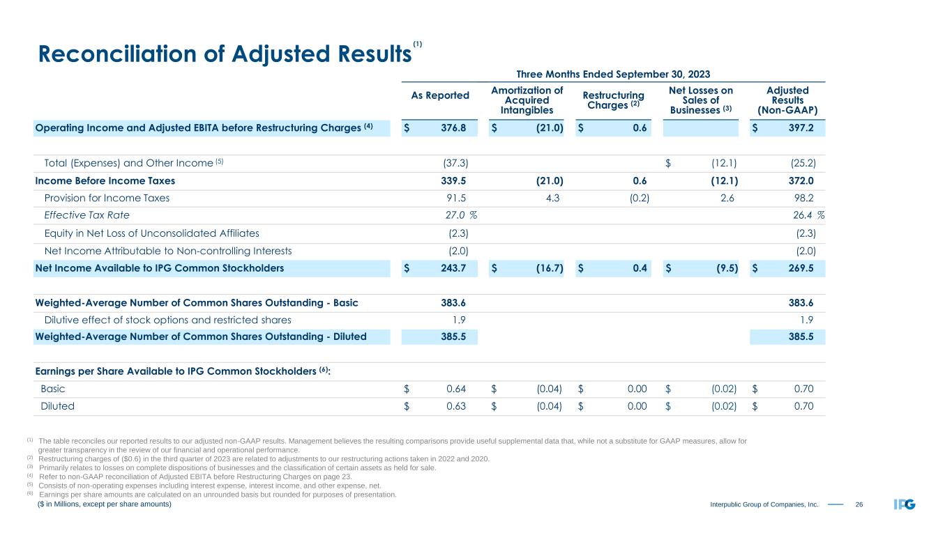 25Interpublic Group of Companies, Inc. Media, Data & Engagement Solutions (2) Integrated Advertising & Creativity Led Solutions (3) Specialized Communications & Experiential Solutions (4) Corporate and Other (5) IPG Consolidated (1) Nine Months Ended September 30, Nine Months Ended September 30, Nine Months Ended September 30, Nine Months Ended September 30, Nine Months Ended September 30, 2024 2023 (6) 2024 2023 (6) 2024 2023 (6) 2024 2023 2024 2023 Revenue Before Billable Expenses $ 3,050.5 $ 3,086.8 $ 2,640.4 $ 2,656.5 $ 1,061.8 $ 1,071.1 $ 6,752.7 $ 6,814.4 Segment/Adjusted EBITA $ 469.5 $ 433.5 $ 374.6 $ 358.4 $ 175.9 $ 194.2 $ (91.2) $ (47.2) $ 928.8 $ 938.9 Restructuring Charges (7) 0.8 (1.3) 0.3 (0.2) 0.3 0.7 0.0 0.1 1.4 (0.7) Segment/Adjusted EBITA before Restructuring Charges $ 470.3 $ 432.2 $ 374.9 $ 358.2 $ 176.2 $ 194.9 $ (91.2) $ (47.1) $ 930.2 $ 938.2 Margin (%) of Revenue Before Billable Expenses 15.4 % 14.0 % 14.2 % 13.5 % 16.6 % 18.2 % 13.8 % 13.8 % ($ in Millions) Adjusted EBITA before Restructuring Charges by Segment (1) (1) Adjusted EBITA before restructuring charges is calculated as net income available to IPG common stockholders before provision for incomes taxes, total (expenses) and other income, equity in net loss of unconsolidated affiliates, net income attributable to non-controlling interests, amortization of acquired intangibles and restructuring charges. (2) Comprised of IPG Mediabrands, Acxiom and our digital specialist agencies, which includes MRM, R/GA, and Huge. (3) Comprised of McCann Worldgroup, IPG Health, MullenLowe Group, Foote, Cone & Belding ("FCB"), and our domestic integrated agencies. (4) Comprised of Weber Shandwick, Golin, our Experiential agencies, and IPG DXTRA Health. (5) Corporate and Other is primarily comprised of selling, general and administrative expenses including corporate office expenses as well as shared service center and certain other centrally managed expenses that are not fully allocated to operating divisions. (6) Results for the nine months ended September 30, 2023 have been recast to reflect the transfer of certain agencies between reportable segments. (7) Restructuring charges of $1.4 and ($0.7) in the first nine months of 2024 and 2023, respectively, are related to adjustments to our restructuring actions taken in 2022 and 2020.