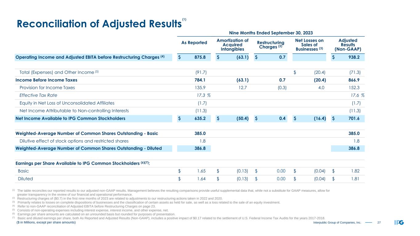 26Interpublic Group of Companies, Inc. Three Months Ended September 30, 2023 As Reported Amortization of Acquired Intangibles Restructuring Charges (2) Net Losses on Sales of Businesses (3) Adjusted Results (Non-GAAP) Operating Income and Adjusted EBITA before Restructuring Charges (4) $ 376.8 $ (21.0) $ 0.6 $ 397.2 Total (Expenses) and Other Income (5) (37.3) $ (12.1) (25.2) Income Before Income Taxes 339.5 (21.0) 0.6 (12.1) 372.0 Provision for Income Taxes 91.5 4.3 (0.2) 2.6 98.2 Effective Tax Rate 27.0 % 26.4 % Equity in Net Loss of Unconsolidated Affiliates (2.3) (2.3) Net Income Attributable to Non-controlling Interests (2.0) (2.0) Net Income Available to IPG Common Stockholders $ 243.7 $ (16.7) $ 0.4 $ (9.5) $ 269.5 Weighted-Average Number of Common Shares Outstanding - Basic 383.6 383.6 Dilutive effect of stock options and restricted shares 1.9 1.9 Weighted-Average Number of Common Shares Outstanding - Diluted 385.5 385.5 Earnings per Share Available to IPG Common Stockholders (6): Basic $ 0.64 $ (0.04) $ 0.00 $ (0.02) $ 0.70 Diluted $ 0.63 $ (0.04) $ 0.00 $ (0.02) $ 0.70 ($ in Millions, except per share amounts) (1) The table reconciles our reported results to our adjusted non-GAAP results. Management believes the resulting comparisons provide useful supplemental data that, while not a substitute for GAAP measures, allow for greater transparency in the review of our financial and operational performance. (2) Restructuring charges of ($0.6) in the third quarter of 2023 are related to adjustments to our restructuring actions taken in 2022 and 2020. (3) Primarily relates to losses on complete dispositions of businesses and the classification of certain assets as held for sale. (4) Refer to non-GAAP reconciliation of Adjusted EBITA before Restructuring Charges on page 23. (5) Consists of non-operating expenses including interest expense, interest income, and other expense, net. (6) Earnings per share amounts are calculated on an unrounded basis but rounded for purposes of presentation. Reconciliation of Adjusted Results (1)