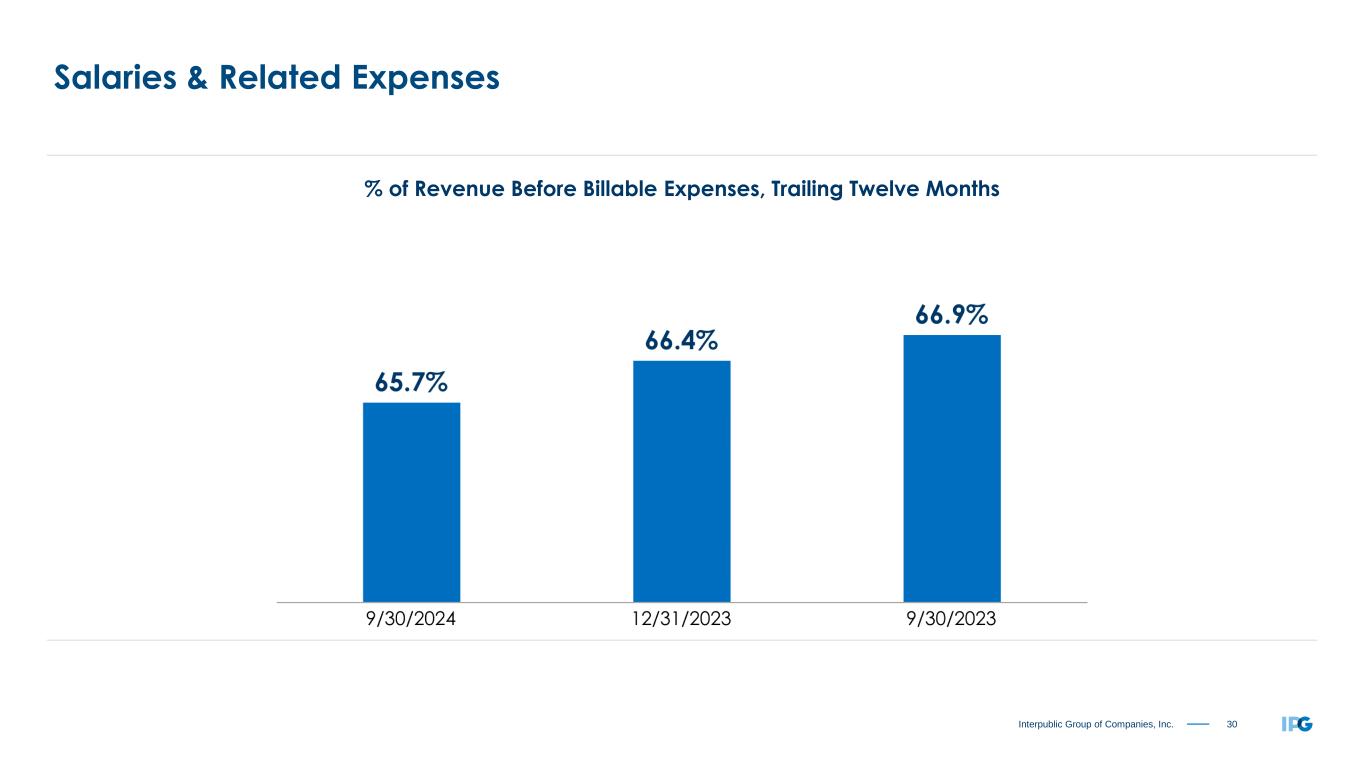 29Interpublic Group of Companies, Inc. Metrics Update CATEGORY: SALARIES & RELATED OFFICE & OTHER DIRECT FINANCIAL (% of Revenue Before Billable Expenses) (% of Revenue Before Billable Expenses) METRIC: Trailing Twelve Months Trailing Twelve Months Available Liquidity Base, Benefits & Tax Occupancy Expense Credit Facility Covenant Incentive Expense All Other Office & Other Direct Expenses Severance Expense Temporary Help All Other Salaries & Related Expense