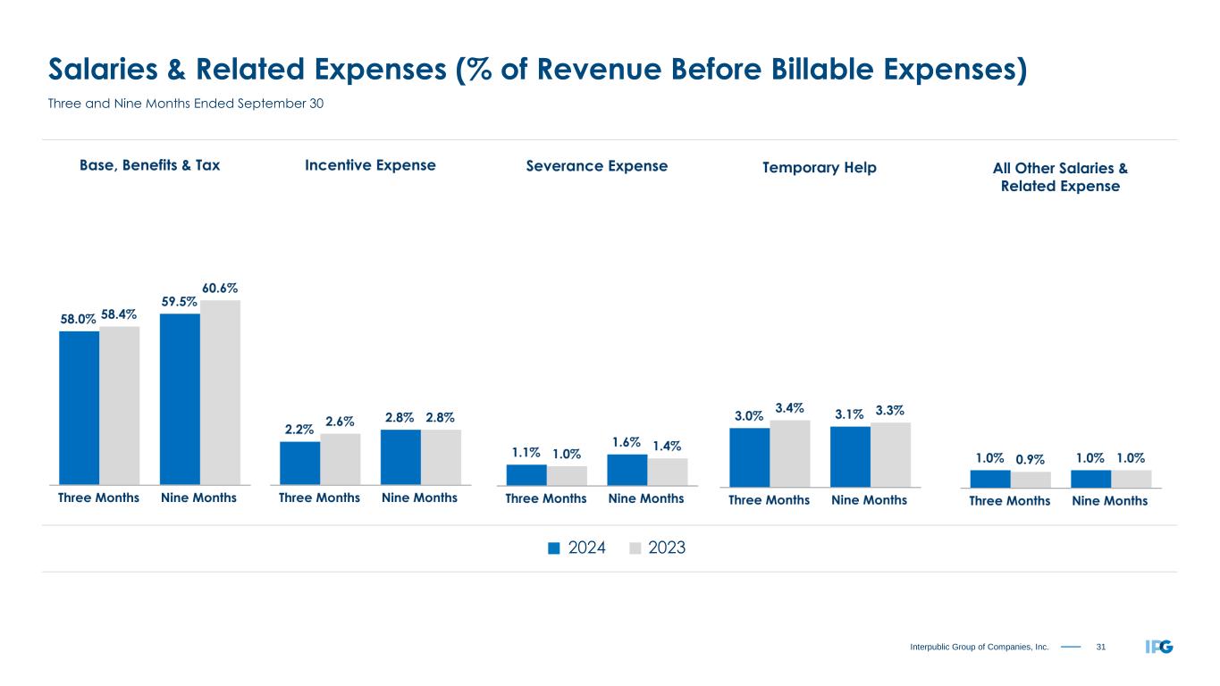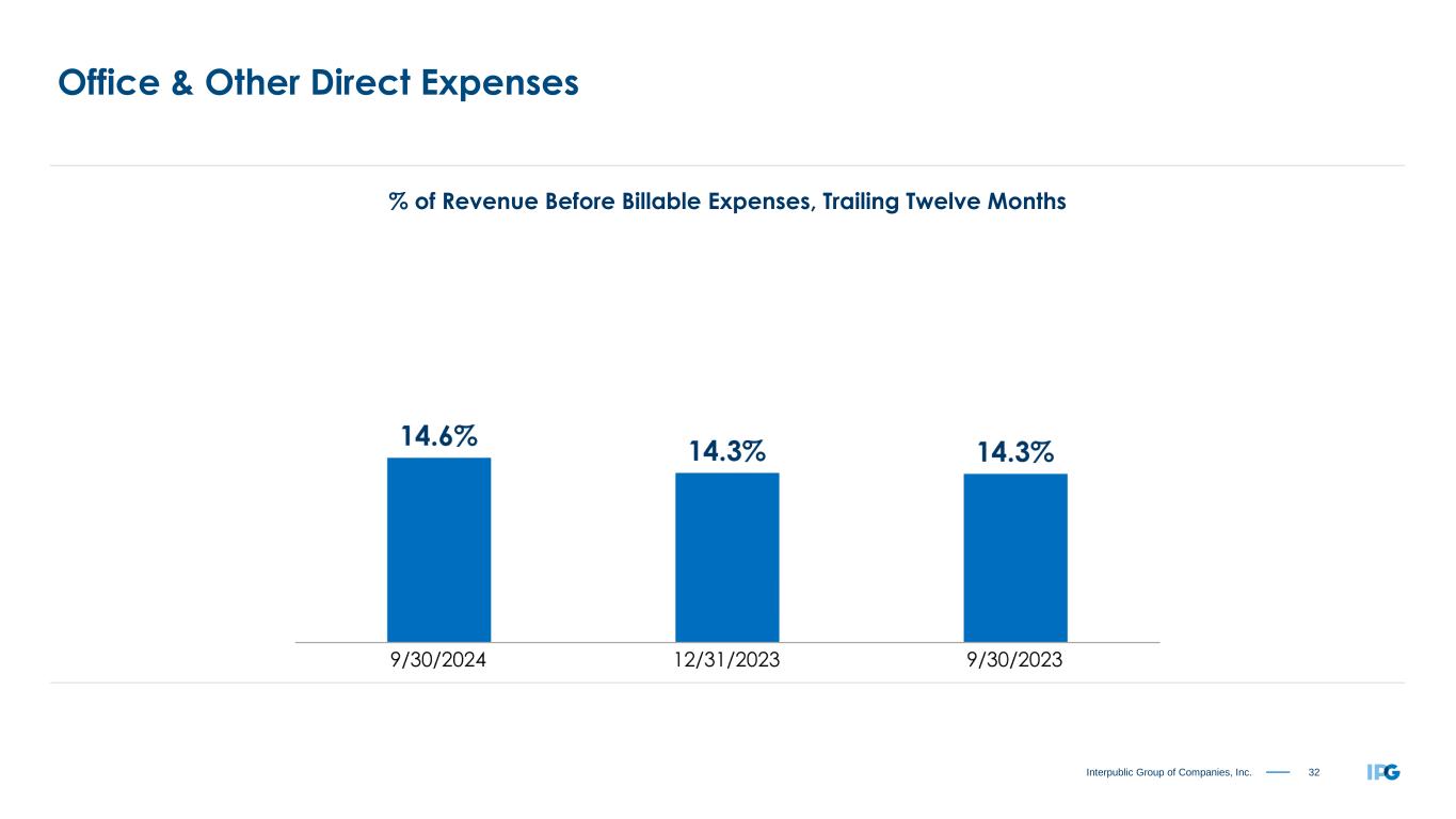31Interpublic Group of Companies, Inc. Salaries & Related Expenses (% of Revenue Before Billable Expenses) Three and Nine Months Ended September 30 2024 2023