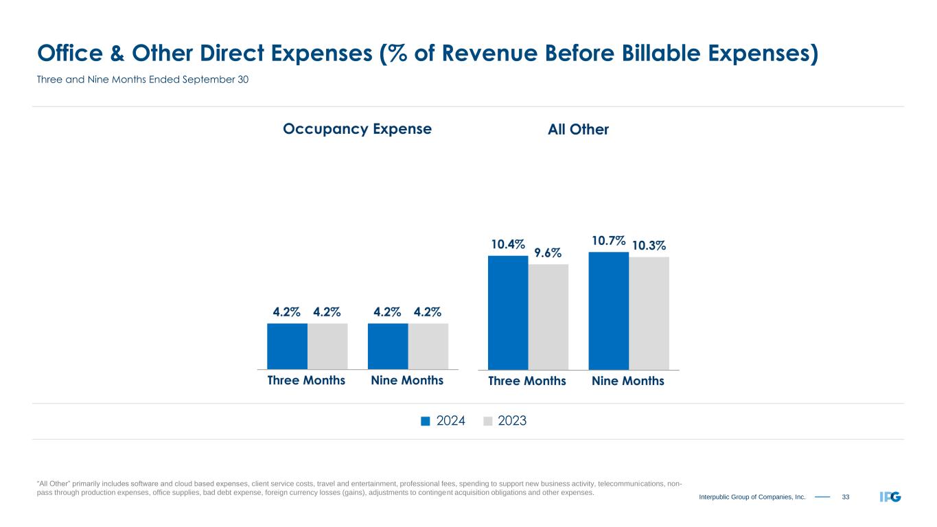 33Interpublic Group of Companies, Inc. Office & Other Direct Expenses (% of Revenue Before Billable Expenses) “All Other” primarily includes software and cloud based expenses, client service costs, travel and entertainment, professional fees, spending to support new business activity, telecommunications, non- pass through production expenses, office supplies, bad debt expense, foreign currency losses (gains), adjustments to contingent acquisition obligations and other expenses. 2024 2023 Three and Nine Months Ended September 30