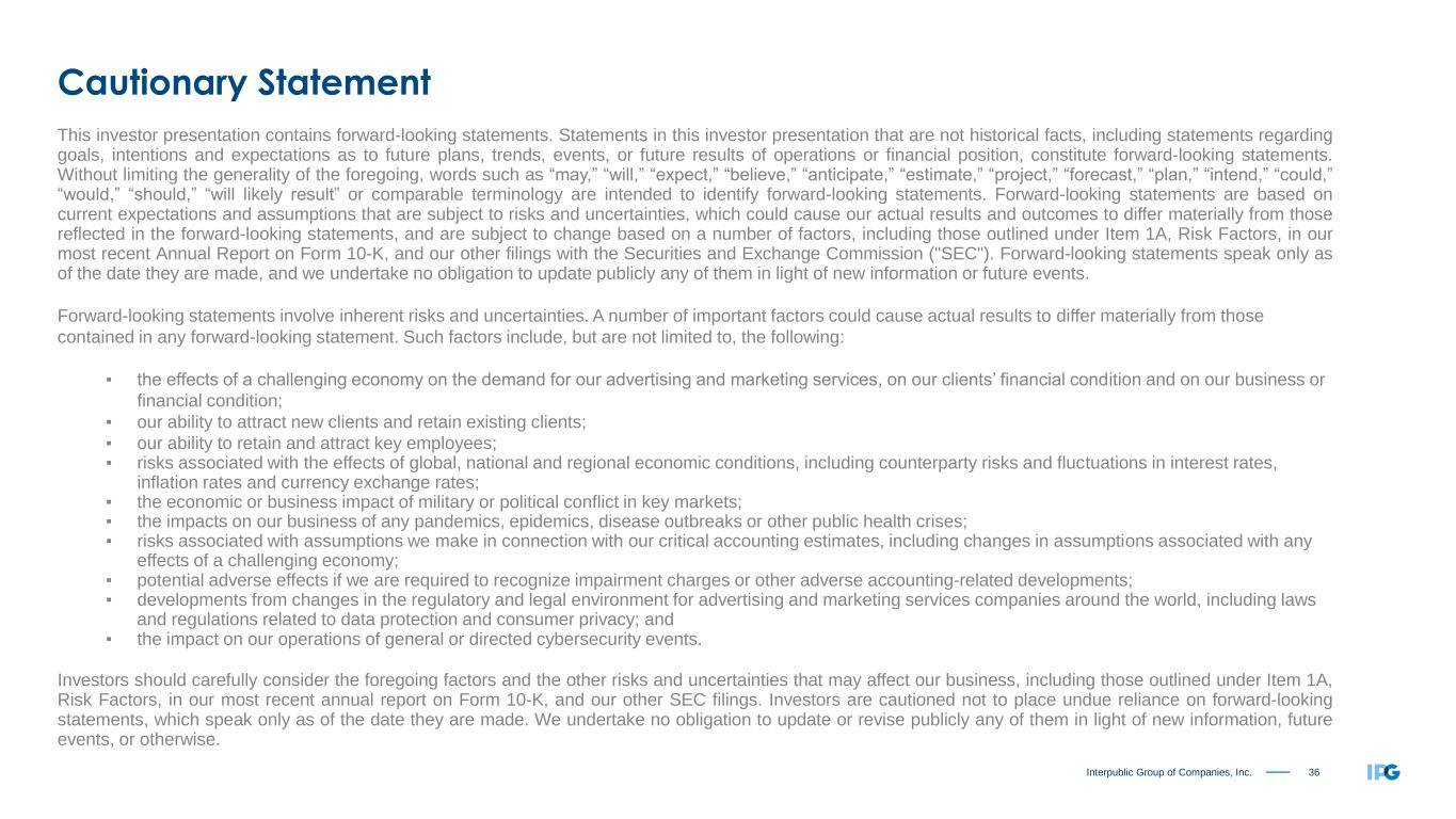 36Interpublic Group of Companies, Inc. Cautionary Statement This investor presentation contains forward-looking statements. Statements in this investor presentation that are not historical facts, including statements regarding goals, intentions and expectations as to future plans, trends, events, or future results of operations or financial position, constitute forward-looking statements. Without limiting the generality of the foregoing, words such as “may,” “will,” “expect,” “believe,” “anticipate,” “estimate,” “project,” “forecast,” “plan,” “intend,” “could,” “would,” “should,” “will likely result” or comparable terminology are intended to identify forward-looking statements. Forward-looking statements are based on current expectations and assumptions that are subject to risks and uncertainties, which could cause our actual results and outcomes to differ materially from those reflected in the forward-looking statements, and are subject to change based on a number of factors, including those outlined under Item 1A, Risk Factors, in our most recent Annual Report on Form 10-K, and our other filings with the Securities and Exchange Commission ("SEC"). Forward-looking statements speak only as of the date they are made, and we undertake no obligation to update publicly any of them in light of new information or future events. Forward-looking statements involve inherent risks and uncertainties. A number of important factors could cause actual results to differ materially from those contained in any forward-looking statement. Such factors include, but are not limited to, the following: ▪ the effects of a challenging economy on the demand for our advertising and marketing services, on our clients’ financial condition and on our business or financial condition; ▪ our ability to attract new clients and retain existing clients; ▪ our ability to retain and attract key employees; ▪ risks associated with the effects of global, national and regional economic conditions, including counterparty risks and fluctuations in interest rates, inflation rates and currency exchange rates; ▪ the economic or business impact of military or political conflict in key markets; ▪ the impacts on our business of any pandemics, epidemics, disease outbreaks or other public health crises; ▪ risks associated with assumptions we make in connection with our critical accounting estimates, including changes in assumptions associated with any effects of a challenging economy; ▪ potential adverse effects if we are required to recognize impairment charges or other adverse accounting-related developments; ▪ developments from changes in the regulatory and legal environment for advertising and marketing services companies around the world, including laws and regulations related to data protection and consumer privacy; and ▪ the impact on our operations of general or directed cybersecurity events. Investors should carefully consider the foregoing factors and the other risks and uncertainties that may affect our business, including those outlined under Item 1A, Risk Factors, in our most recent annual report on Form 10-K, and our other SEC filings. Investors are cautioned not to place undue reliance on forward-looking statements, which speak only as of the date they are made. We undertake no obligation to update or revise publicly any of them in light of new information, future events, or otherwise.