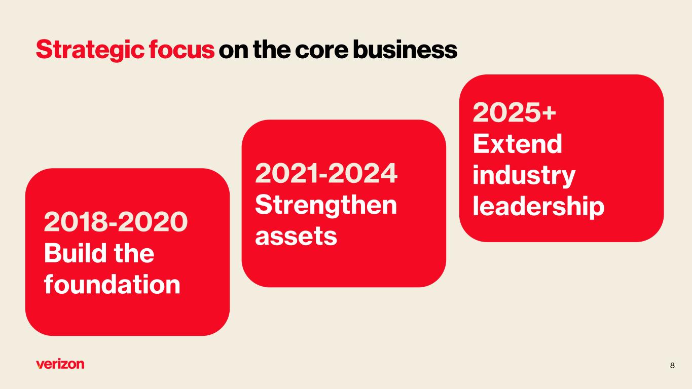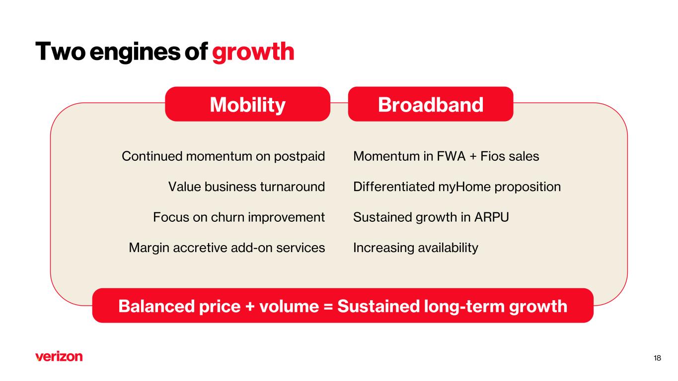 Unmatched scale & differentiated value proposition Mobility America’s best wireless network Satellite partnerships 144.7M connections myPlan + B2B Broadband Fios leads industry in Net Promoter scores 18M Fios1 + 60M FWA2 premises covered 11.9M connections myHome + B2B Uniquely positioned with full owner’s economics Consumer + Business 1Fios open for sale 2FWA households and businesses covered 10