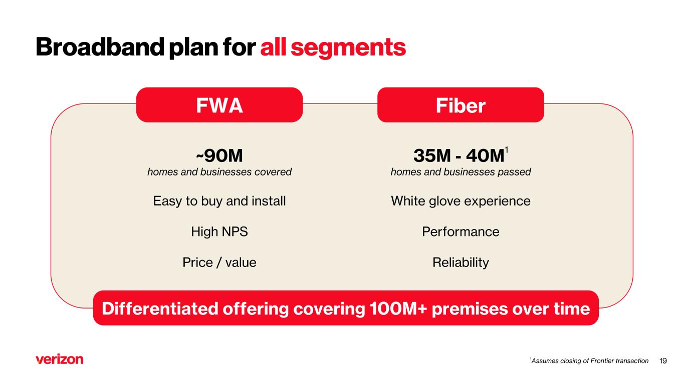 1Assumes closing of Frontier transaction Broadband plan for all segments ~90M homes and businesses covered Easy to buy and install High NPS Price / value 35M - 40M 1 homes and businesses passed White glove experience Performance Reliability Differentiated offering covering 100M+ premises over time FWA Fiber 19