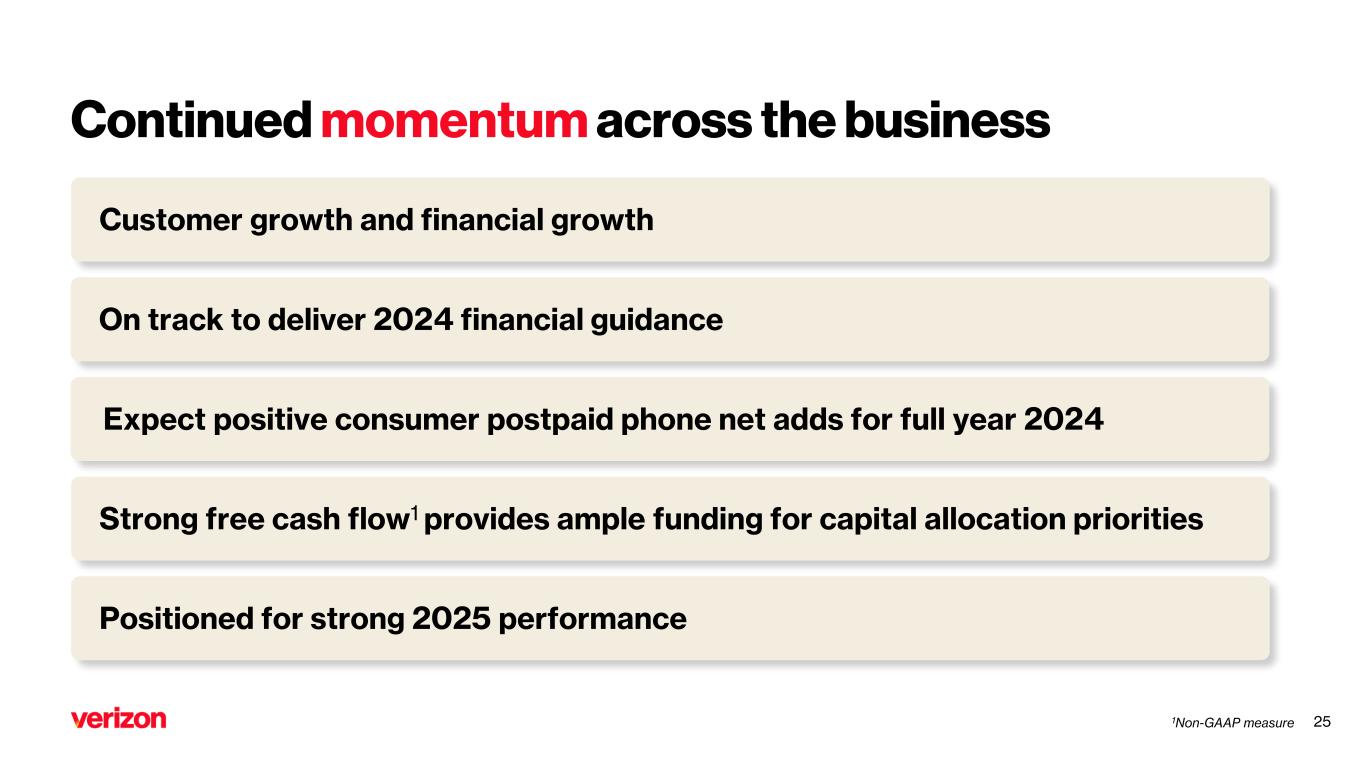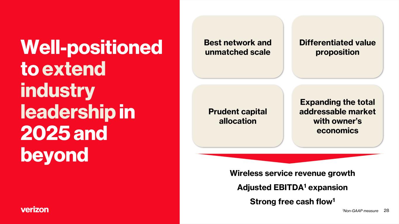 Well-positioned to extend industry leadership in 2025 and beyond Differentiated value proposition Expanding the total addressable market with owner’s economics Best network and unmatched scale Prudent capital allocation Wireless service revenue growth Adjusted EBITDA1 expansion Strong free cash flow1 281Non-GAAP measure