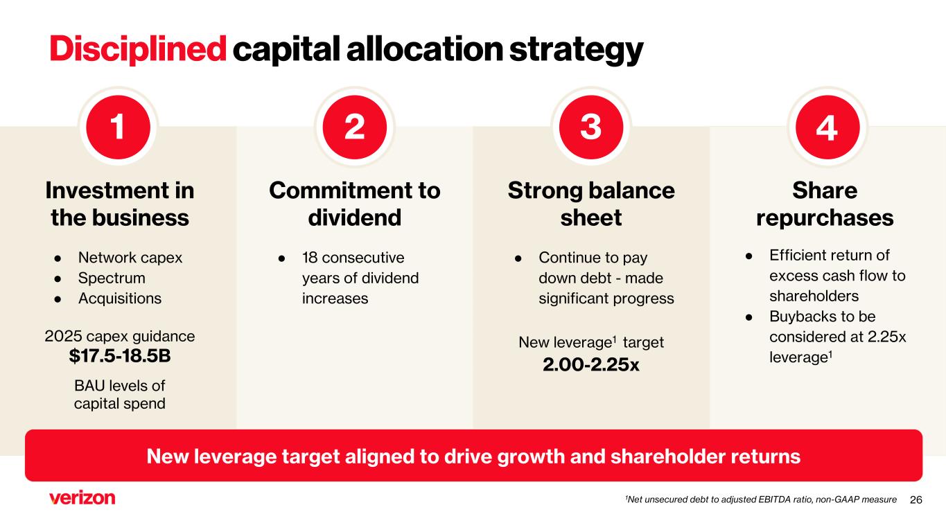 Verizon confidential and proprietary. Unauthorized disclosure, reproduction or other use prohibited. Continued momentum across the business On track to deliver 2024 financial guidance Positioned for strong 2025 performance Customer growth and financial growth Strong free cash flow1 provides ample funding for capital allocation priorities Expect positive consumer postpaid phone net adds for full year 2024 1Non-GAAP measure 25