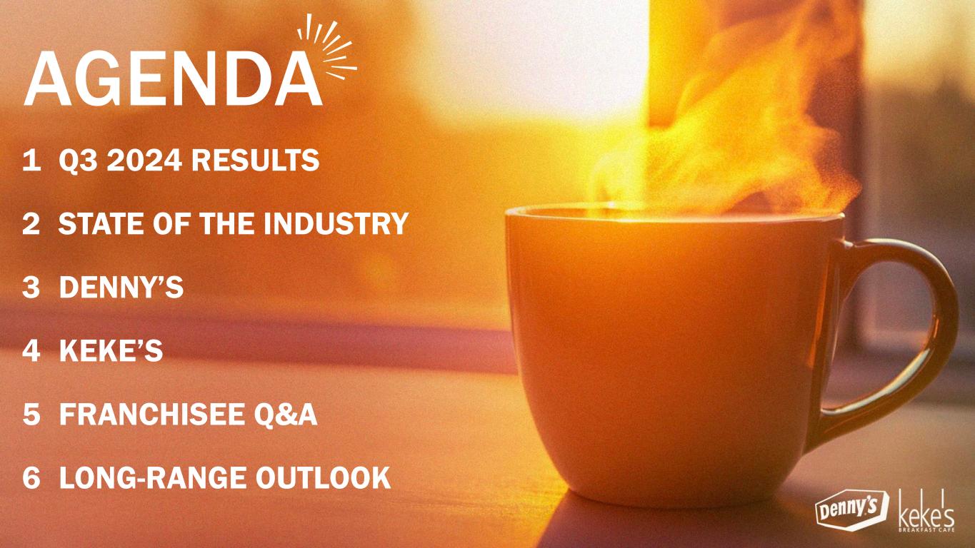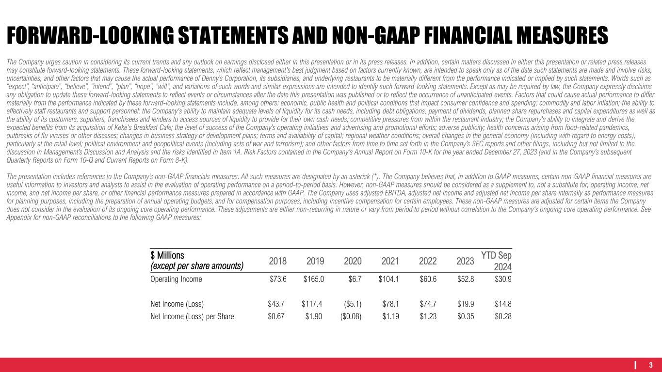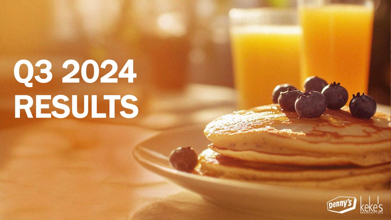 SPARTANBURG, S.C., October 22, 2024 - Denny’s Corporation (the "Company") (NASDAQ: DENN), owner and operator of Denny's Inc. ("Denny's") and Keke's Inc. ("Keke's") today reported results for its third quarter ended September 25, 2024 and provided a business update on the Company’s operations.