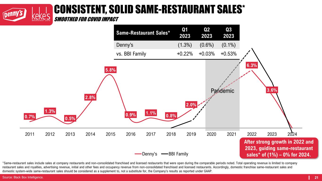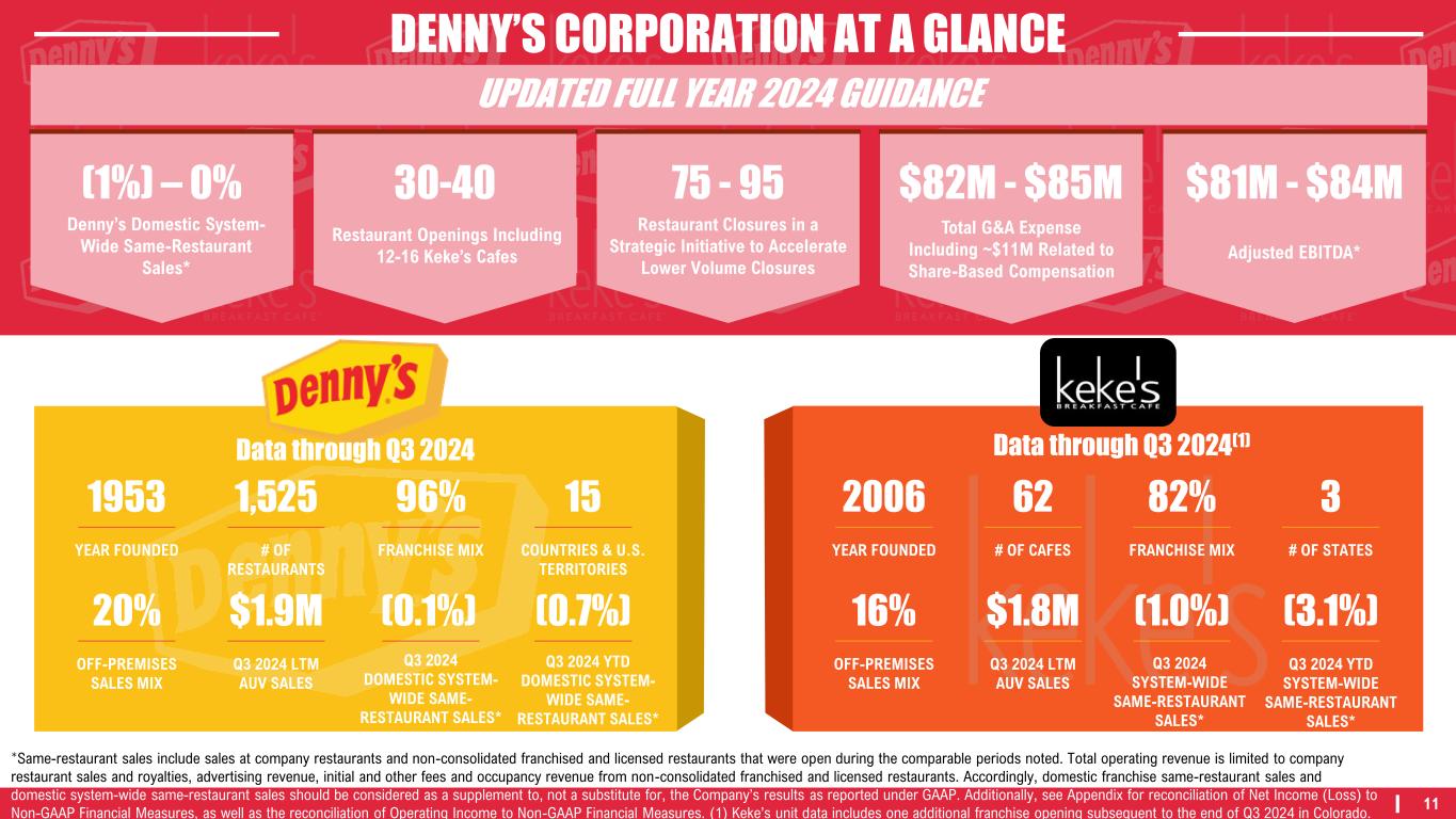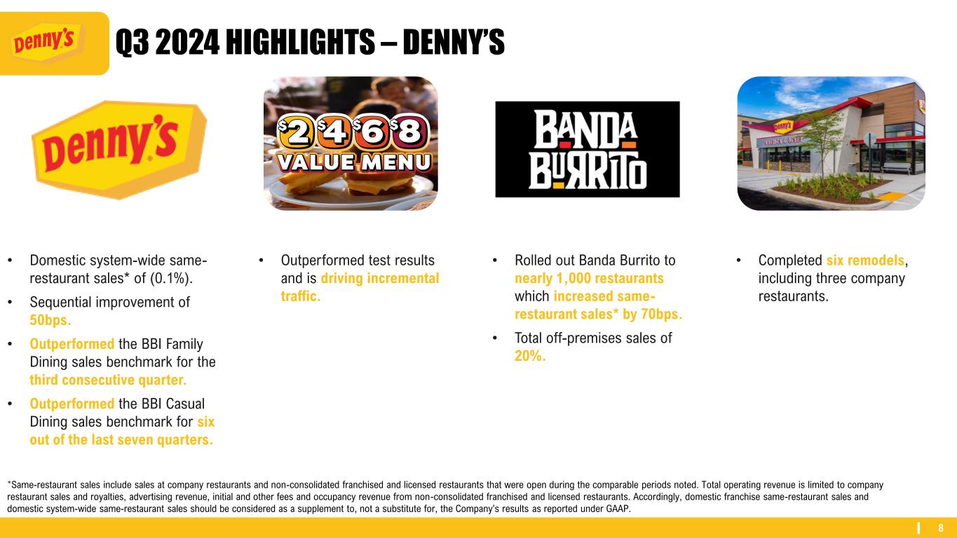•Denny's domestic system-wide same-restaurant sales** were (0.1%) compared to the equivalent fiscal period in 2023, including (0.1%) at domestic franchised restaurants and (0.4%) at company restaurants.