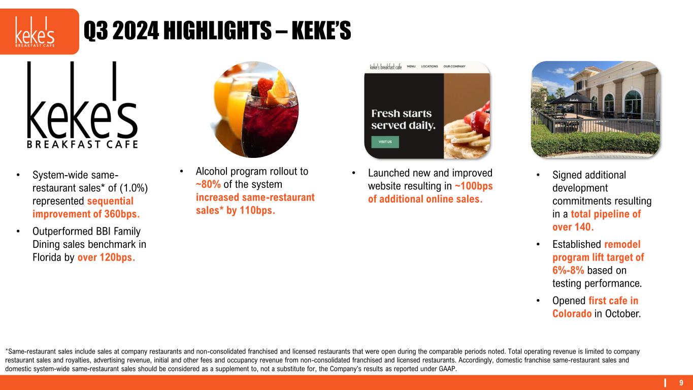 Kelli Valade, Chief Executive Officer, stated, “Our third quarter sales results directly reflect ongoing brand investments and dedicated focus on value that resulted in outpacing the category. Denny’s domestic system-wide same-restaurant sales** outperformed the BBI Family Dining index for the third consecutive quarter driven by the relaunch of our fan favorite $2-$4-$6-$8 value menu and the continued expansion of off-premises with our third virtual brand, Banda Burrito. Keke’s also experienced significant sequential improvement in same-restaurant sales** as our initiatives to enact foundational marketing strategies and expand the alcohol program continued our efforts to close the gap to the competitive set. We are also very excited to be hosting an Investor Day today.”