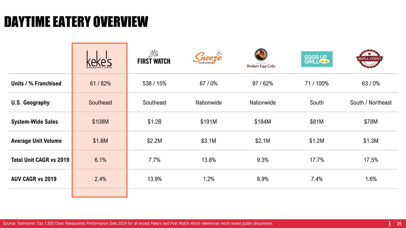 92 FOOTPRINT Orlando Tampa Gainesville Jacksonville Tallahassee West Palm BeachFort Myers DMA Cafes % of FL Sales Orlando 25 44% Tampa 20 31% Jacksonville 5 7% West Palm Beach 4 9% Fort Myers 3 5% Gainesville 1 2% Tallahassee 1 2% Florida Tennessee 2 Nashville Colorado 1 Denver Data through October 19, 2024. After the end of Q3 2024, Keke’s opened one additional franchise cafe in Colorado.