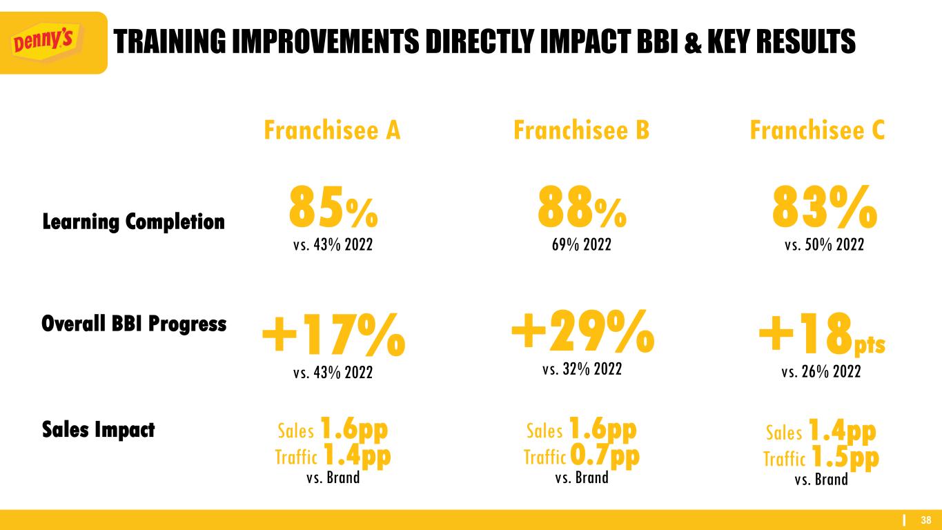 38 TRAINING IMPROVEMENTS DIRECTLY IMPACT BBI & KEY RESULTS Franchisee A Franchisee B Franchisee C 88% 69% 2022 +29% vs. 32% 2022 Sales 1.6pp Traffic 0.7pp vs. Brand +18pts vs. 26% 2022 Sales 1.4pp Traffic 1.5pp vs. Brand 83% vs. 50% 2022 85% vs. 43% 2022 +17% vs. 43% 2022 Sales 1.6pp Traffic 1.4pp vs. Brand Learning Completion Overall BBI Progress Sales Impact