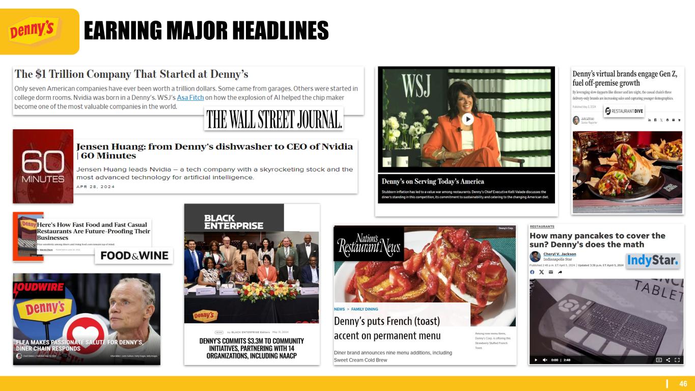 45 “Denny’s is a place where dreams and waffles come true.” - Stephen Colbert “Denny’s is like the Louvre. If the Louvre had a gumball machine and half the paintings were velvet.” - Patton Oswalt “Denny’s transcends all cultural and ethnic and economic boundaries. It’s a beautiful place. You can find everybody in Denny’s. I was just there.” - Flea of Red Hot Chili Peppers “It had all the coffee you could drink and no one would chase you out.” - Jensen Huang HOLD A PLACE IN RELEVANT CONVERSATIONS