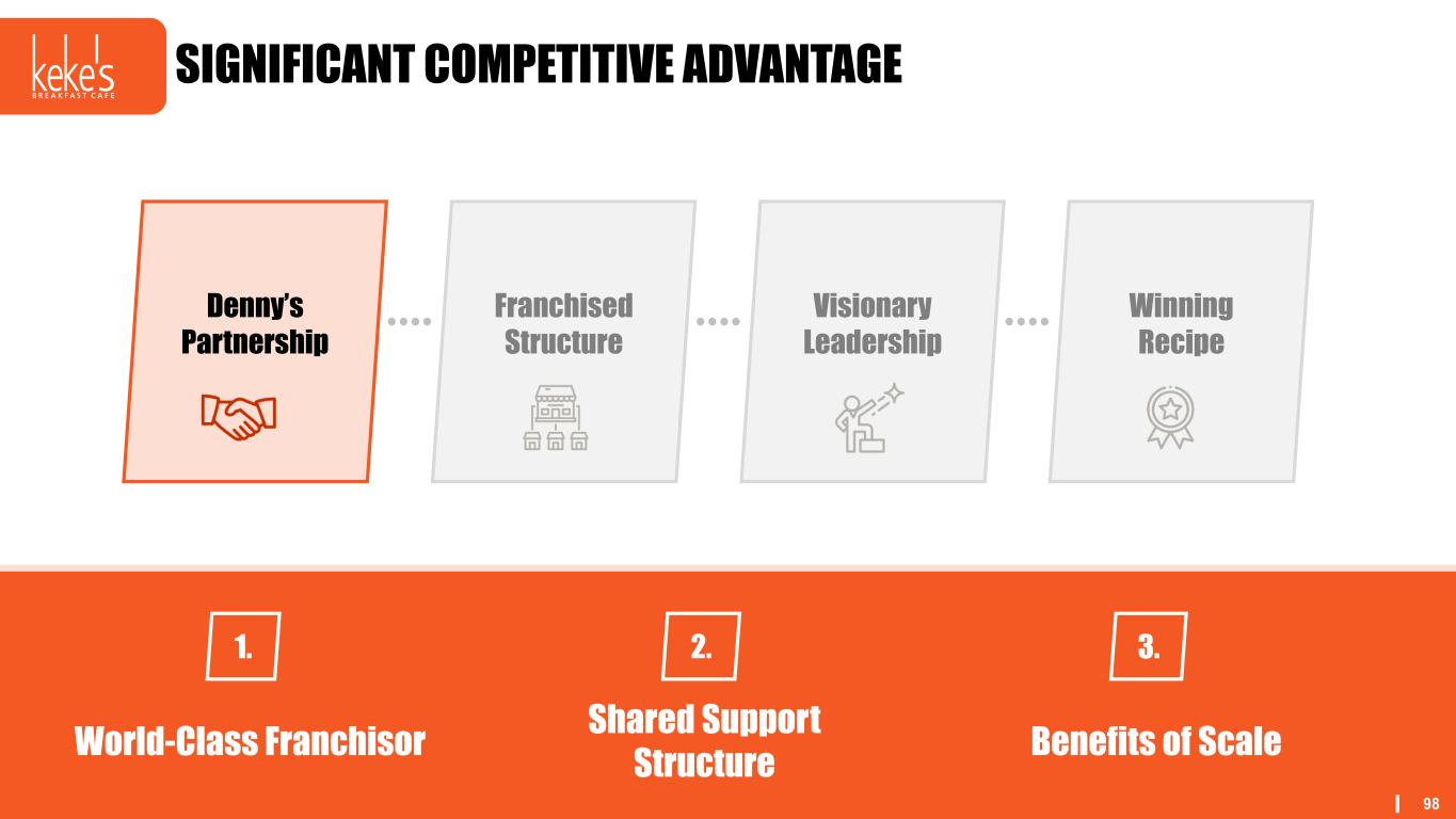 98 SIGNIFICANT COMPETITIVE ADVANTAGE Franchised Structure Visionary Leadership Winning Recipe Denny’s Partnership 1. World-Class Franchisor 2. Shared Support Structure 3. Benefits of Scale