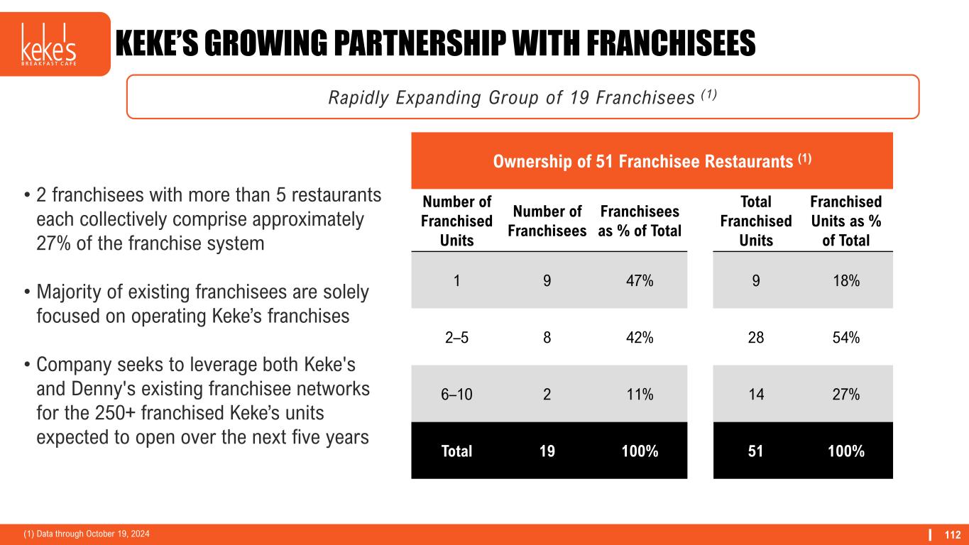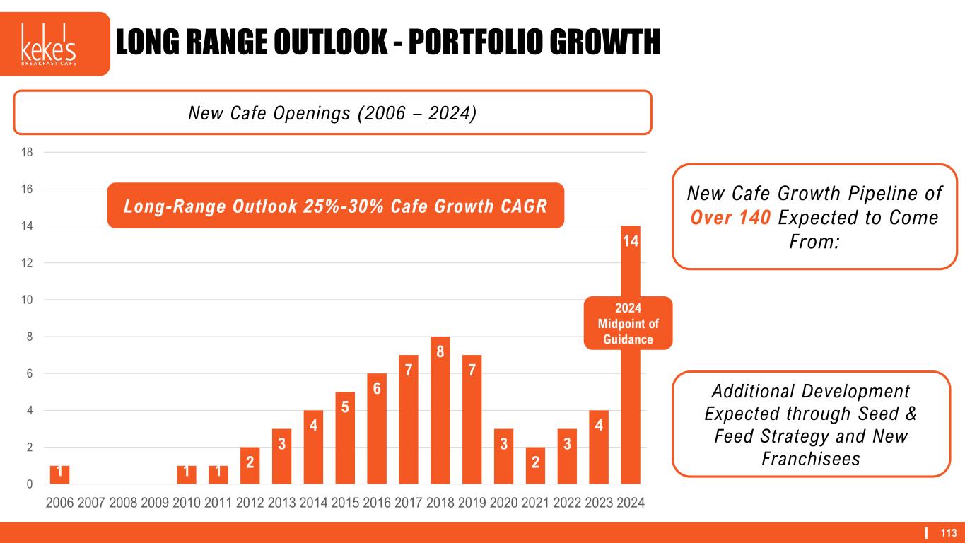 112 KEKE’S GROWING PARTNERSHIP WITH FRANCHISEES Ownership of 51 Franchisee Restaurants (1) Number of Franchised Units Number of Franchisees Franchisees as % of Total Total Franchised Units Franchised Units as % of Total 1 9 47% 9 18% 2–5 8 42% 28 54% 6–10 2 11% 14 27% Total 19 100% 51 100% Rapidly Expanding Group of 19 Franchisees (1) • 2 franchisees with more than 5 restaurants each collectively comprise approximately 27% of the franchise system • Majority of existing franchisees are solely focused on operating Keke’s franchises • Company seeks to leverage both Keke's and Denny's existing franchisee networks for the 250+ franchised Keke’s units expected to open over the next five years (1) Data through October 19, 2024