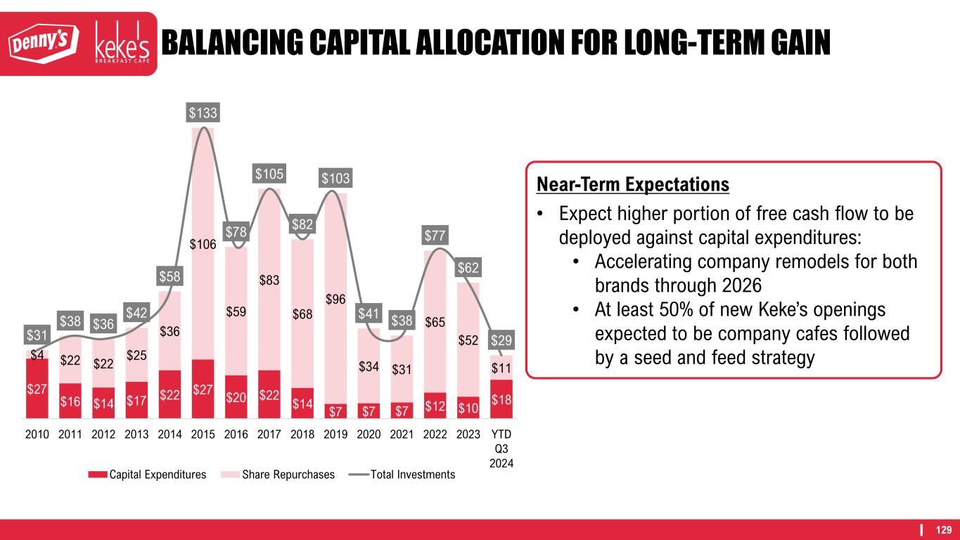129 Near-Term Expectations • Expect higher portion of free cash flow to be deployed against capital expenditures: • Accelerating company remodels for both brands through 2026 • At least 50% of new Keke’s openings expected to be company cafes followed by a seed and feed strategy BALANCING CAPITAL ALLOCATION FOR LONG-TERM GAIN $27 $16 $14 $17 $22 $27 $20 $22 $14 $7 $7 $7 $12 $10 $18 $4 $22 $22 $25 $36 $106 $59 $83 $68 $96 $34 $31 $65 $52 $11 $31 $38 $36 $42 $58 $133 $78 $105 $82 $103 $41 $38 $77 $62 $29 2010 2011 2012 2013 2014 2015 2016 2017 2018 2019 2020 2021 2022 2023 YTD Q3 2024 Capital Expenditures Share Repurchases Total Investments