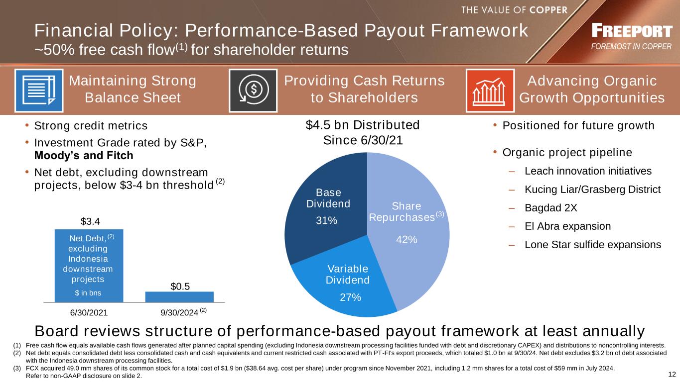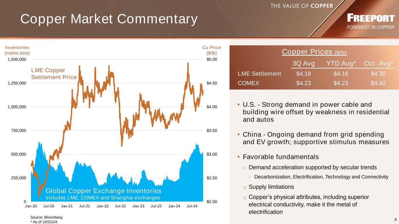 2 This presentation contains forward-looking statements in which FCX discusses its potential future performance, operations and projects. Forward-looking statements are all statements other than statements of historical facts, such as plans, projections, or expectations relating to business outlook, strategy, goals or targets; global market conditions; ore grades and milling rates; production and sales volumes; unit net cash costs (credits) and operating costs; capital expenditures; operating plans (including mine sequencing); cash flows; liquidity; PT Freeport Indonesia’s (PT-FI) commissioning, remediation and ramp up of its new smelter and completion and full production at the precious metals refinery (PMR) (collectively, the new downstream processing facilities); potential extension of PT-FI’s IUPK beyond 2041; export licenses; export duties; export volumes; timing of shipments of inventoried production; FCX’s commitment to deliver responsibly produced copper and molybdenum, including plans to implement, validate and maintain validation of its operating sites under specific frameworks; execution of FCX’s energy and climate strategies and the underlying assumptions and estimated impacts on FCX’s business and stakeholders related thereto; achievement of 2030 climate targets and 2050 net zero aspiration; improvements in operating procedures and technology innovations and applications; exploration efforts and results; development and production activities, rates and costs; future organic growth opportunities; tax rates; the impact of copper, gold and molybdenum price changes; the impact of deferred intercompany profits on earnings; mineral reserve and mineral resource estimates; final resolution of settlements associated with ongoing legal and environmental proceedings; debt repurchases; and the ongoing implementation of FCX’s financial policy and future returns to shareholders, including dividend payments (base or variable) and share repurchases. The words “anticipates,” “may,” “can,” “plans,” “believes,” “estimates,” “expects,” “projects,” “targets,” “intends,” “likely,” “will,” “should,” “could,” “to be,” “potential,” “assumptions,” “guidance,” “aspirations,” “future,” “commitments,” “pursues,” “initiatives,” “objectives,” “opportunities,” “strategy” and any similar expressions are intended to identify those assertions as forward-looking statements. The declaration and payment of dividends (base or variable), and timing and amount of any share repurchases are at the discretion of the Board of Directors (Board) and management, respectively, and are subject to a number of factors, including not exceeding FCX’s net debt target, capital availability, FCX’s financial results, cash requirements, global economic conditions, changes in laws, contractual restrictions and other factors deemed relevant by the Board or management, as applicable. The share repurchase program may be modified, increased, suspended or terminated at any time at the Board’s discretion. FCX cautions readers that forward-looking statements are not guarantees of future performance and actual results may differ materially from those anticipated, expected, projected or assumed in the forward-looking statements. Important factors that can cause FCX’s actual results to differ materially from those anticipated in the forward-looking statements include, but are not limited to, supply of and demand for, and prices of the commodities FCX produces, primarily copper and gold; PT-FI’s ability to continue to export and sell or inventory copper concentrates and anode slimes through remediation or completion, as applicable, and full ramp-up of its new downstream processing facilities; changes in export duties; completion of remediation activities and achieving full ramp-up of the new smelter in Indonesia; completion and full production at the PMR; production rates; timing of shipments; price and availability of consumables and components FCX purchases as well as constraints on supply and logistics, and transportation services; changes in FCX’s cash requirements, financial position, financing or investment plans; changes in general market, economic, geopolitical, regulatory or industry conditions; reductions in liquidity and access to capital; changes in tax laws and regulations; political and social risks, including the potential effects of violence in Indonesia, civil unrest in Peru, and relations with local communities and Indigenous Peoples; operational risks inherent in mining, with higher inherent risks in underground mining; mine sequencing; changes in mine plans or operational modifications, delays, deferrals or cancellations, including the ability to smelt and refine or inventory; results of technical, economic or feasibility studies; potential inventory adjustments; potential impairment of long-lived mining assets; satisfaction of requirements in accordance with PT-FI’s IUPK to extend mining rights from 2031 through 2041; process relating to the extension of PT-FI’s IUPK beyond 2041; cybersecurity risks; any major public health crisis; labor relations, including labor-related work stoppages and increased costs; compliance with applicable environmental, health and safety laws and regulations; weather- and climate-related risks; environmental risks, including availability of secure water supplies; litigation results; tailings management; FCX’s ability to comply with its responsible production commitments under specific frameworks and any changes to such frameworks; and other factors described in more detail under the heading “Risk Factors” in FCX’s Annual Report on Form 10-K for the year ended December 31, 2023, filed with the U.S. Securities and Exchange Commission. Investors are cautioned that many of the assumptions upon which FCX’s forward-looking statements are based are likely to chan