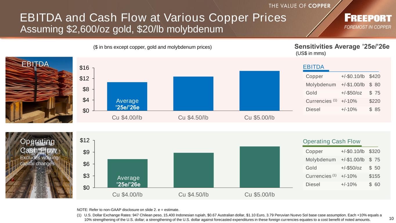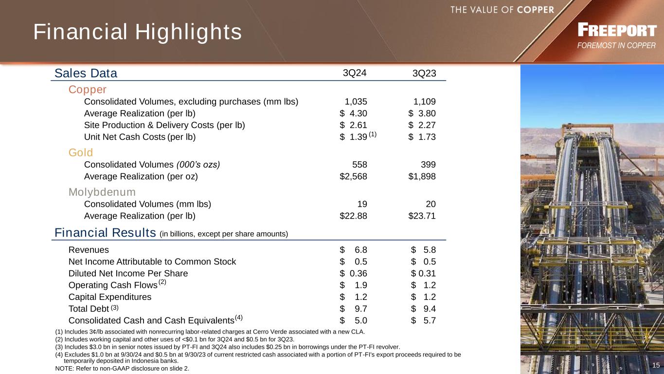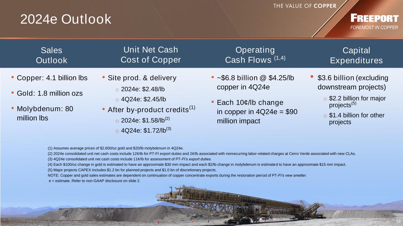 ▪Operating cash flows totaled $1.9 billion in third-quarter 2024. Operating cash flows are expected to approximate $6.8 billion for the year 2024, net of $0.4 billion of working capital and other uses, for the year 2024, based on achievement of current sales volume and cost estimates, and assuming average prices of $4.25 per pound for copper, $2,600 per ounce for gold and $20.00 per pound for molybdenum in fourth-quarter 2024.