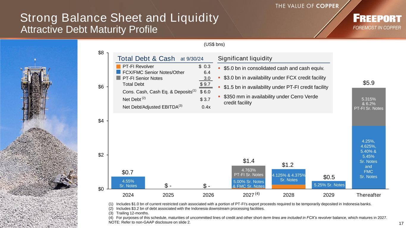 ▪At September 30, 2024, consolidated debt totaled $9.7 billion and consolidated cash and cash equivalents totaled $5.0 billion ($6.0 billion including $1.0 billion of current restricted cash associated with a portion of PT-FI’s export proceeds required to be temporarily deposited in Indonesia banks). Net debt totaled $0.5 billion, excluding $3.2 billion of debt for PT-FI’s new downstream processing facilities. Refer to the supplemental schedule, “Net Debt,” on page IX.
