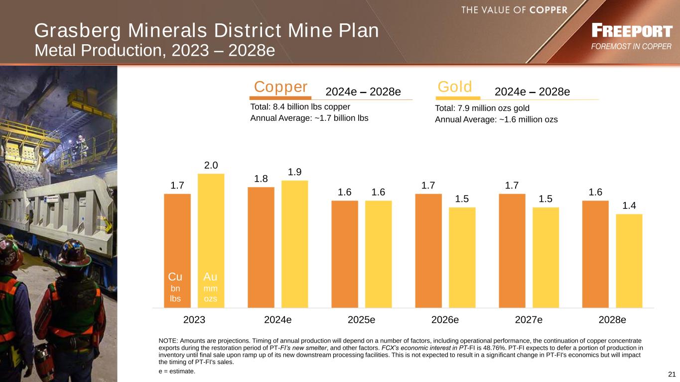 20 NOTE: Consolidated copper sales include 386 mm lbs in 1Q24, 314 mm lbs in 2Q24, 355 mm lbs in 3Q24 and 332 mm lbs in 4Q24e for noncontrolling interests; excludes purchased copper. Estimates are dependent on continuation of copper concentrate exports during the restoration period of PT-FI’s new smelter. 0 200 400 600 800 1000 1200 1Q24 2Q24 3Q24 4Q24e 1,108 931 1,035 980 0 150 300 450 600 1Q24 2Q24 3Q24 4Q24e 361 558 340 0 5 10 15 20 25 1Q24 2Q24 3Q24 4Q24e 20 21 19 20 NOTE: Consolidated gold sales include 289k ozs in 1Q24, 183k ozs in 2Q24, 283k ozs in 3Q24 and 174k ozs in 4Q24e for noncontrolling interests. Estimates are dependent on continuation of copper concentrate exports during the restoration period of PT- FI’s new smelter. (million lbs) Copper Sales (million lbs) Moly Sales Gold Sales (thousand ozs) 2024e Quarterly Sales e = estimate. 568